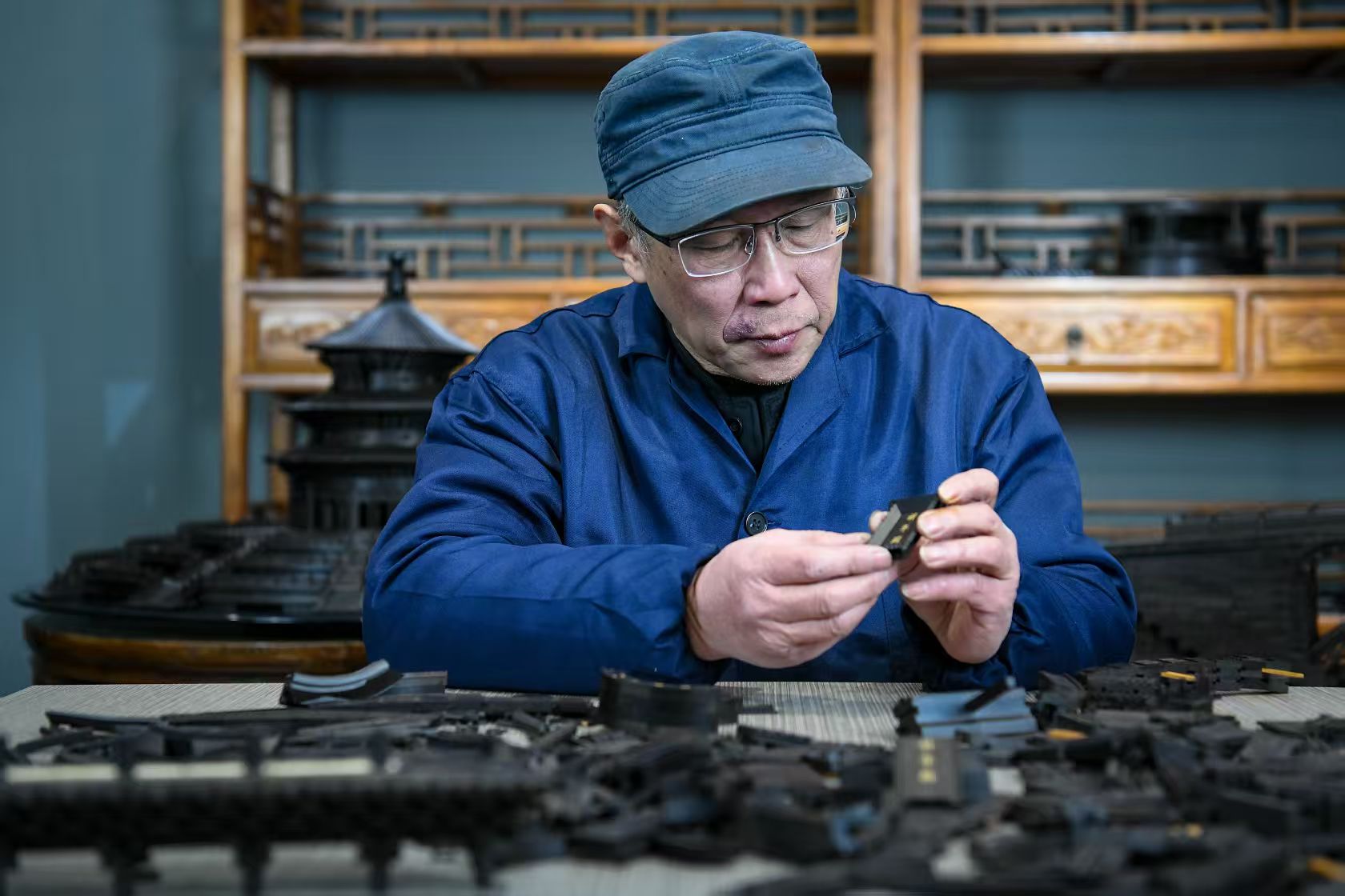 头图为王震华在制作榫卯结构。劳动报记者 颜筱依 摄影