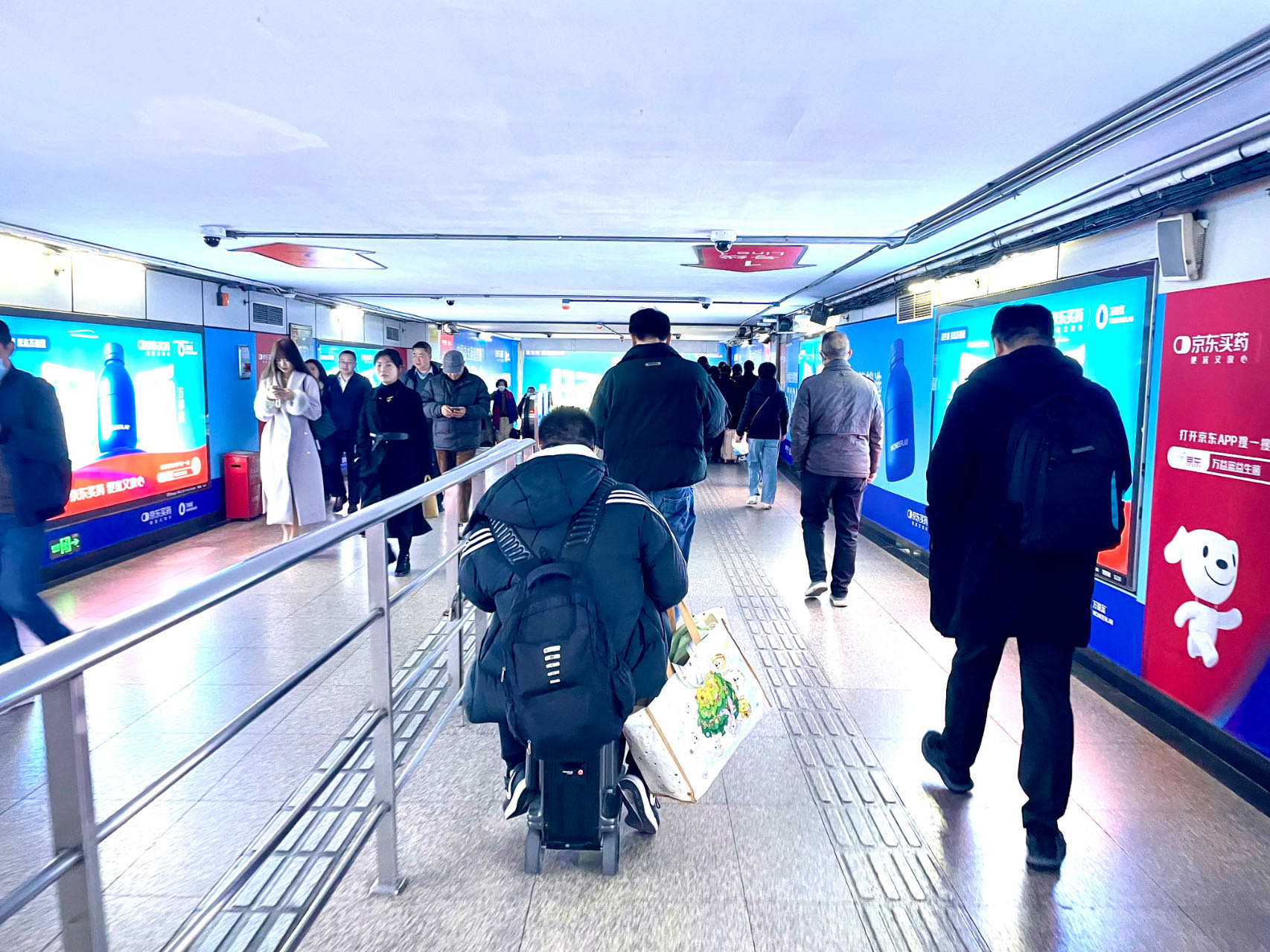 轨交通道内男子“驾驶”骑行箱左钻右蹿