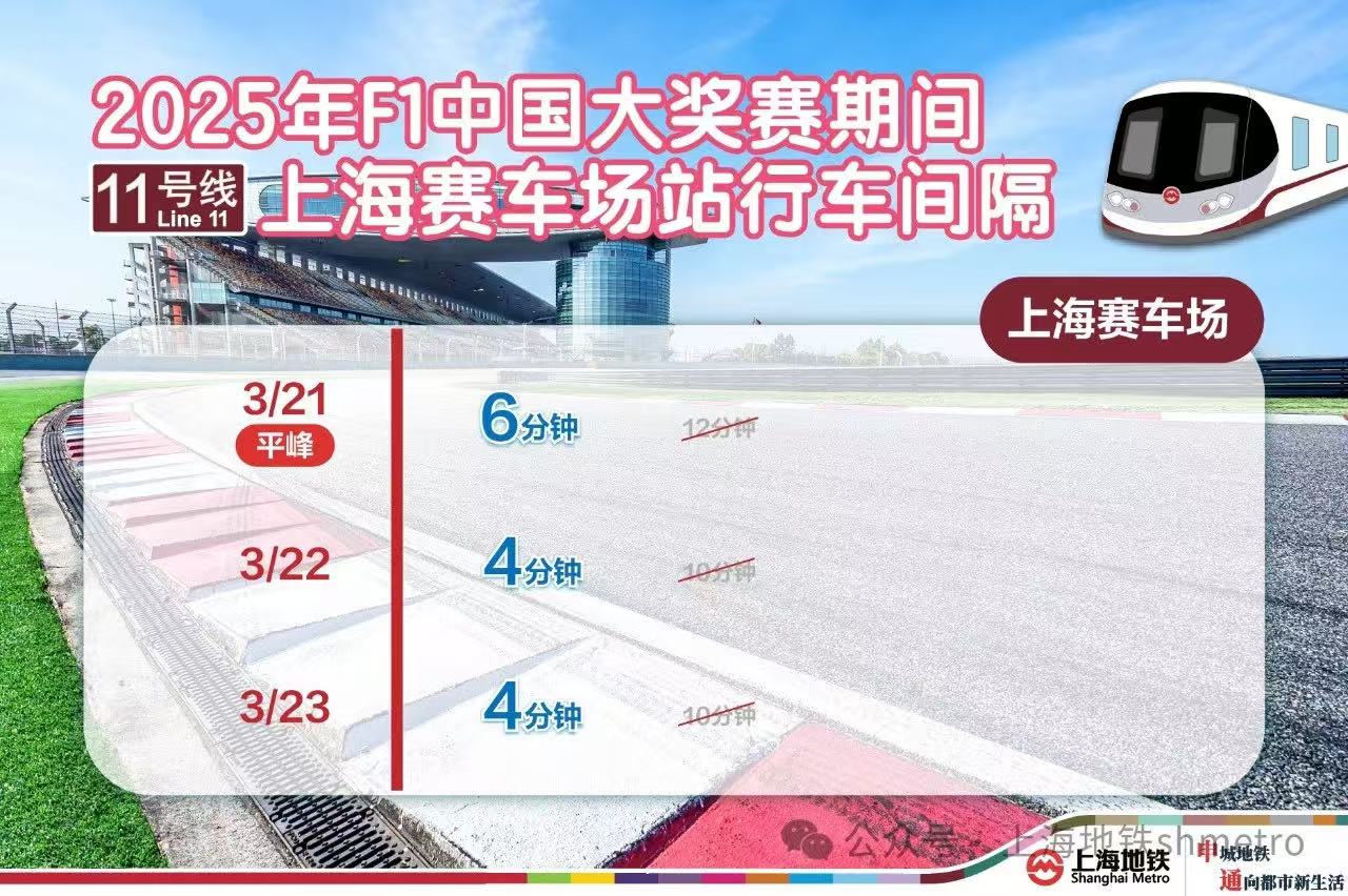 为积极应对大客流,有效保障市民游客观赛出行,赛事期间,地铁11号线将提升保驾等级,启用F1赛事专项列车运行图,加大花桥站至三林站小交路区段的运力供应,大幅缩短重点时段上海赛车场站的行车间隔。其中,3月21日(周五)平峰时段增投列车,上海赛车场站行车间隔由常态的12分钟缩短至6分钟;3月22日至23日(周六、周日),上海赛车场站行车间隔由常态的10分钟缩短为平均4分钟。同时,相关重点车站还将加强客流监控、信息传递,如发现客流密集到达、滞留等情况,现场将及时投放备车,确保运力供应。