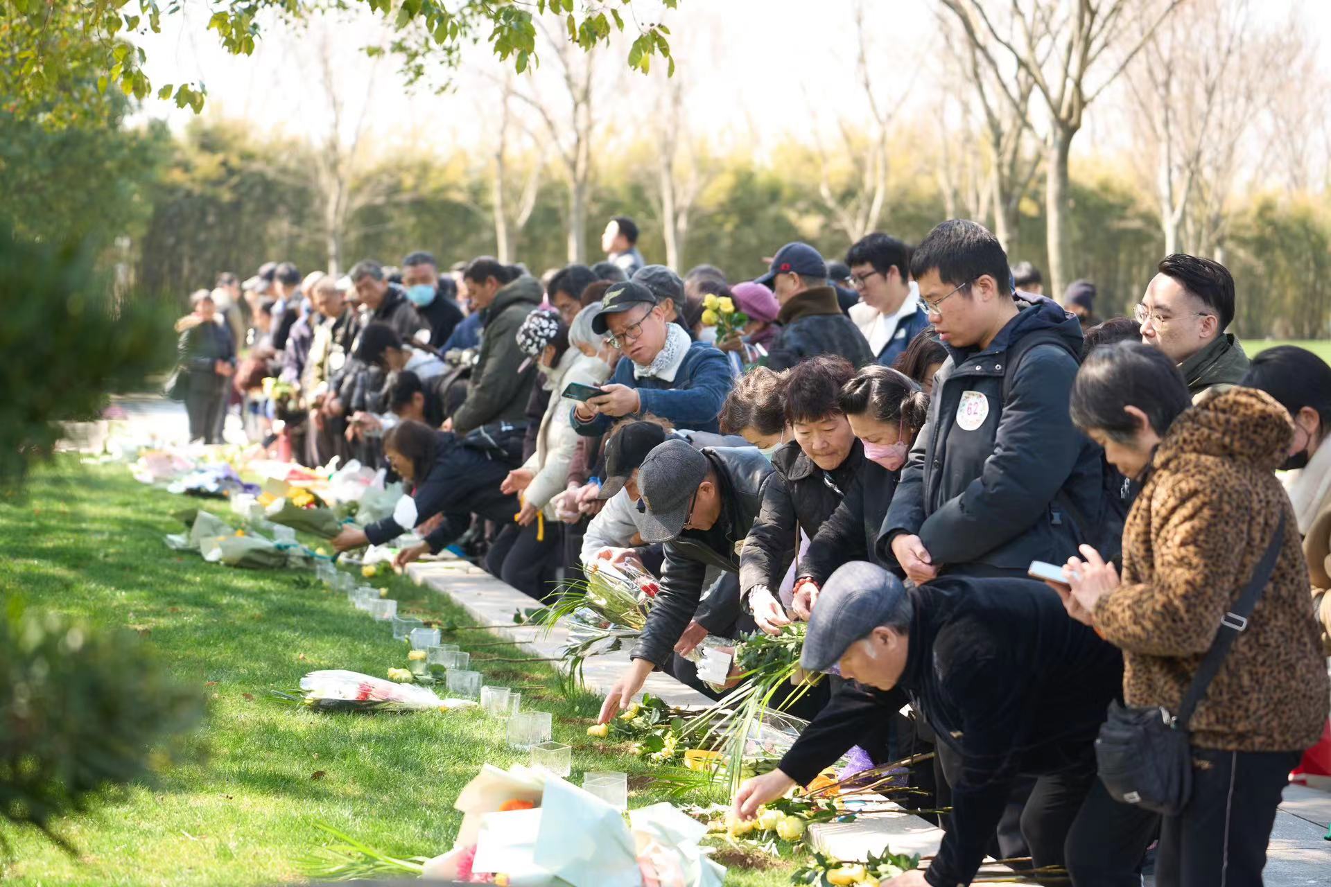 上午10时,纪念仪式正式开始。在庄严肃穆的氛围中,礼仪青年迈着整齐的步伐,将饱含敬意的花环敬献于纪念碑前,寄托着家属对逝者的无尽思念。全场肃立,在静默中共同缅怀、追思。随后的礼敬环节,礼仪人员手捧香茗,以茶为媒,传递对先人的感恩与敬重,现场温情涌动。