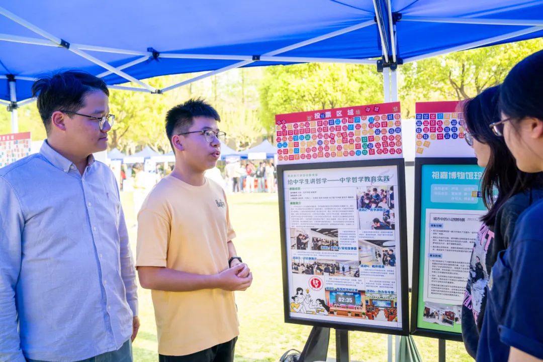 “欢迎来了解我们的课题”“这个课题有趣,我来投一票”。4月8日,复旦大学光草上人头攒动,蓝色棚子下,每个摊位摆放着设计独特的海报,展示着“强国之路”思政大课2023级本科生践行课题作业成果。