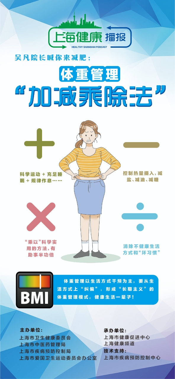 复旦大学上海医学院副院长吴凡曾担任过中国疾控中心首任慢病中心主任,对肥胖与慢病问题十分关注。4月17日,她在首期“上海健康播报”上建议市民做好体重管理的“加减乘除法”。