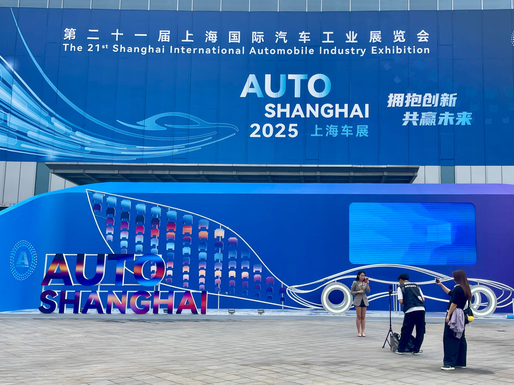 头图为工作人员正在即将启幕的上海车展展示区域录制宣传内容。劳动报记者 包璐影 摄影