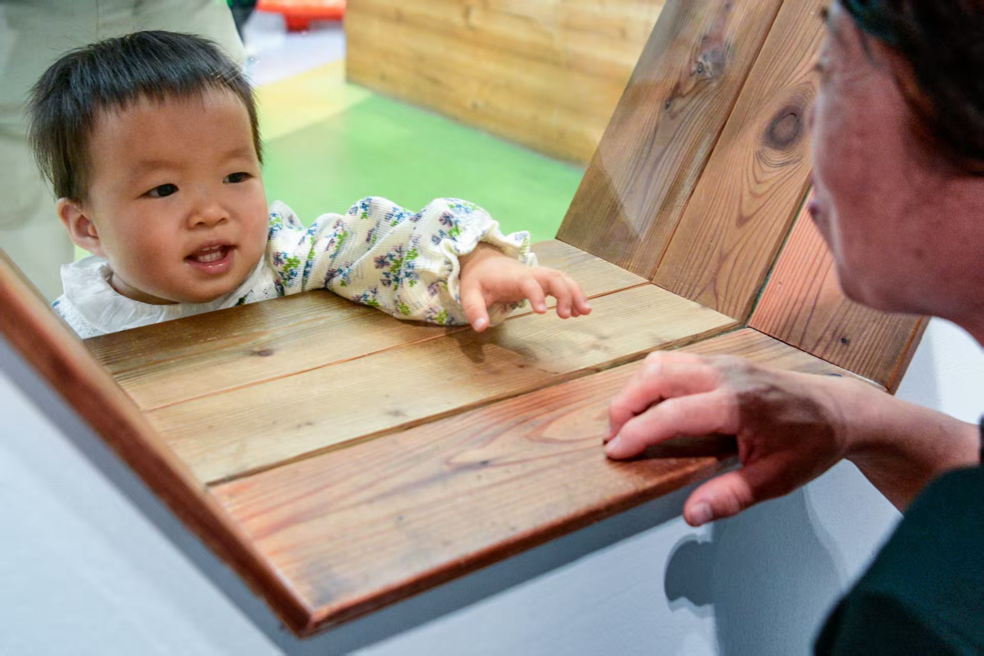 家长在展区外与孩子互动。劳动报记者颜筱依摄影