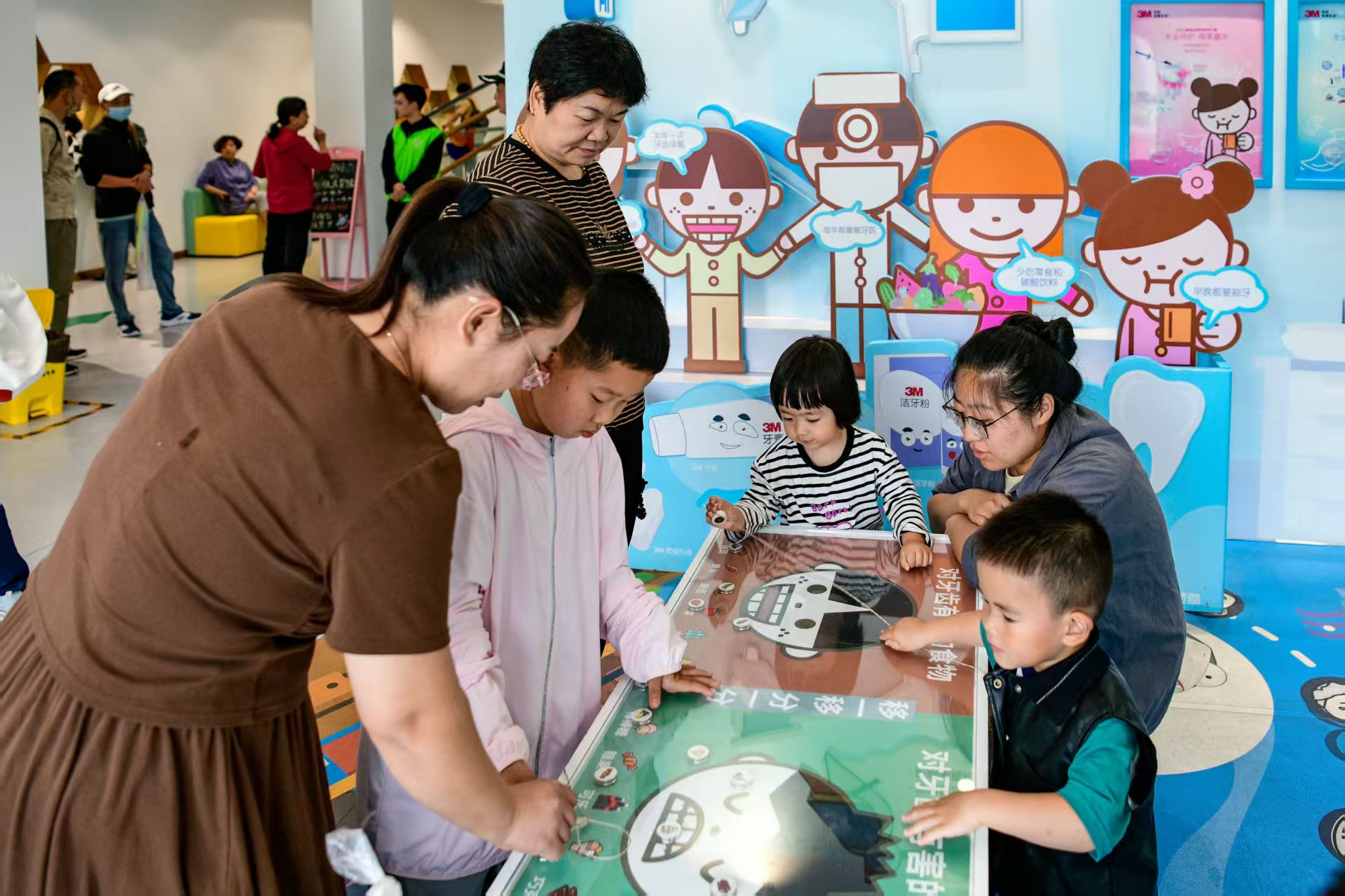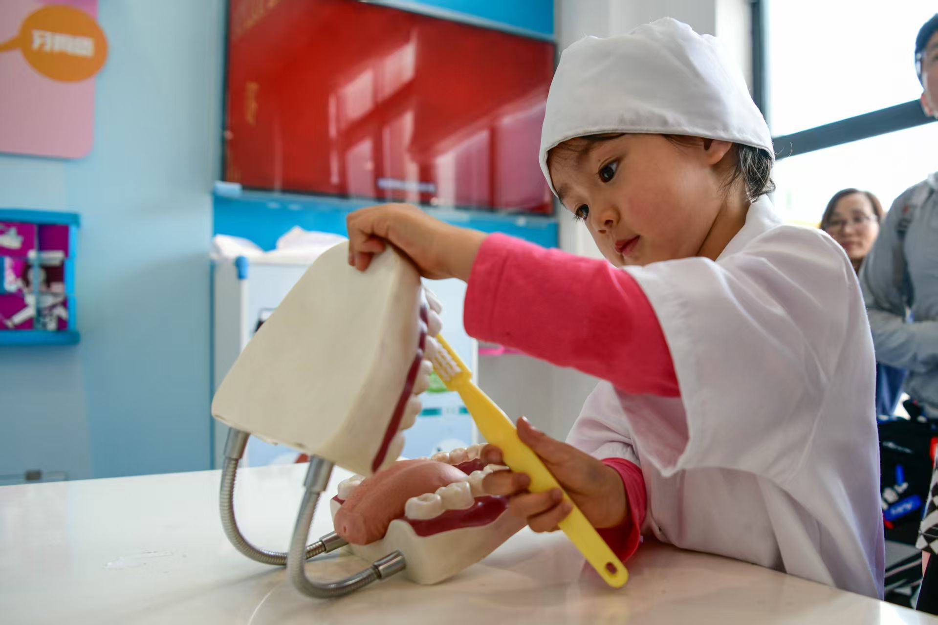 孩童装扮成小小牙医,进行互动体验。劳动报记者颜筱依摄影