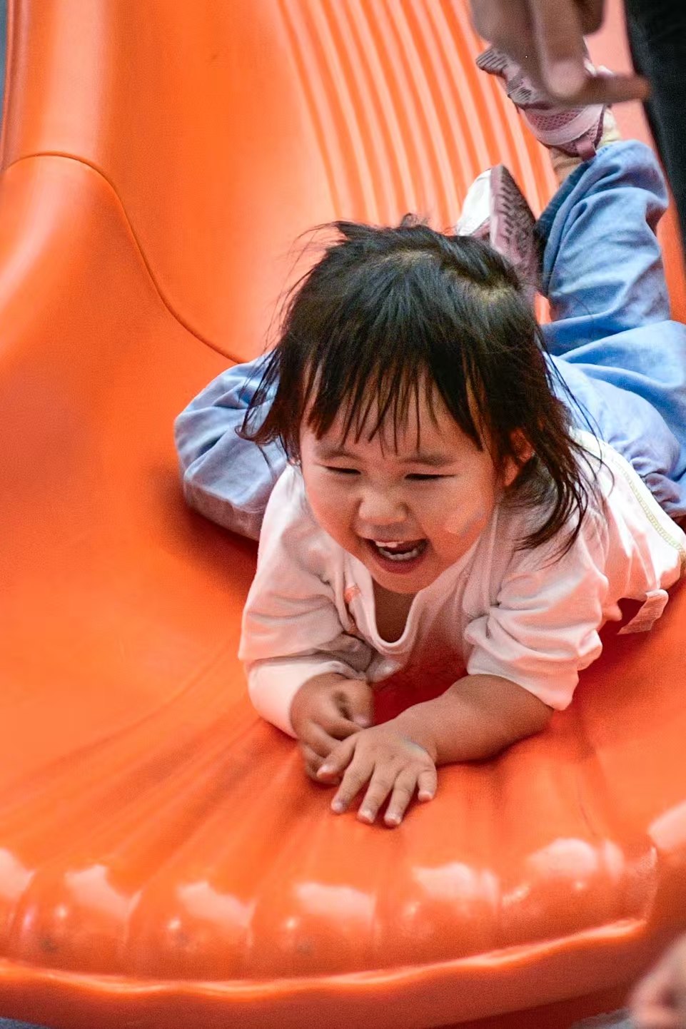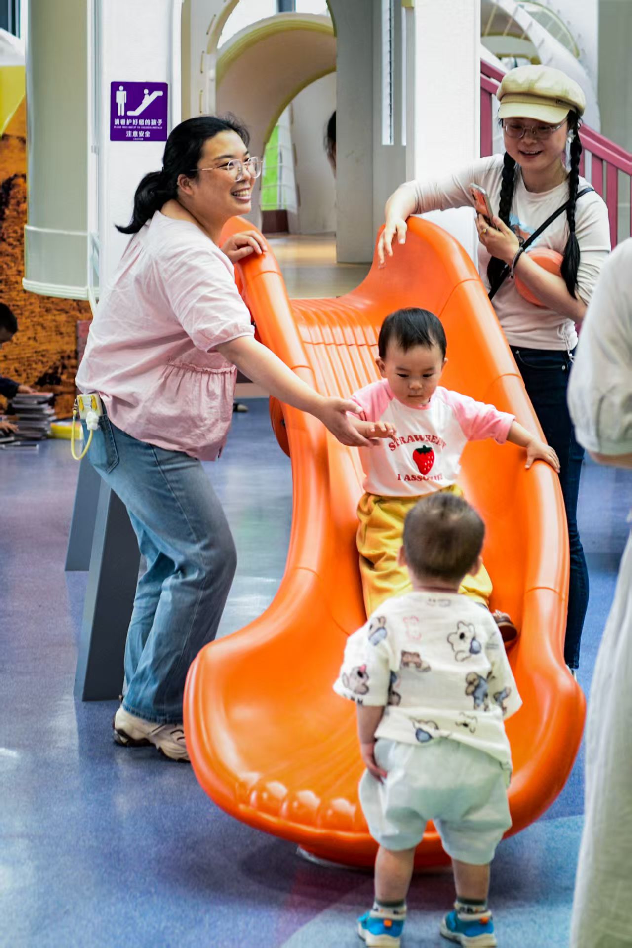 游乐区内,家长陪伴孩子玩滑滑梯。劳动报记者颜筱依摄影