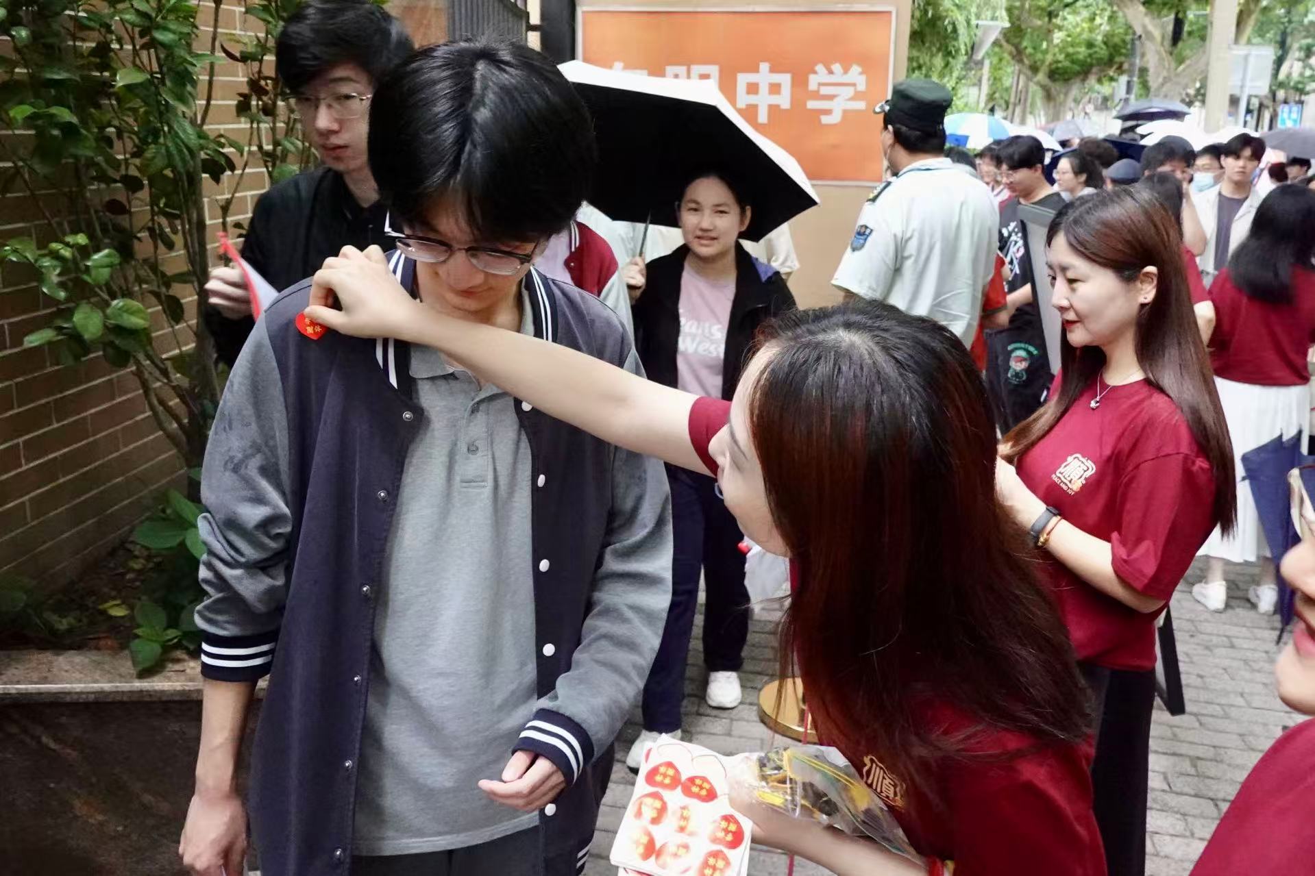 图为卢湾高级中学的老师给考生贴上爱心贴纸。劳动报记者 贡俊祺 摄影