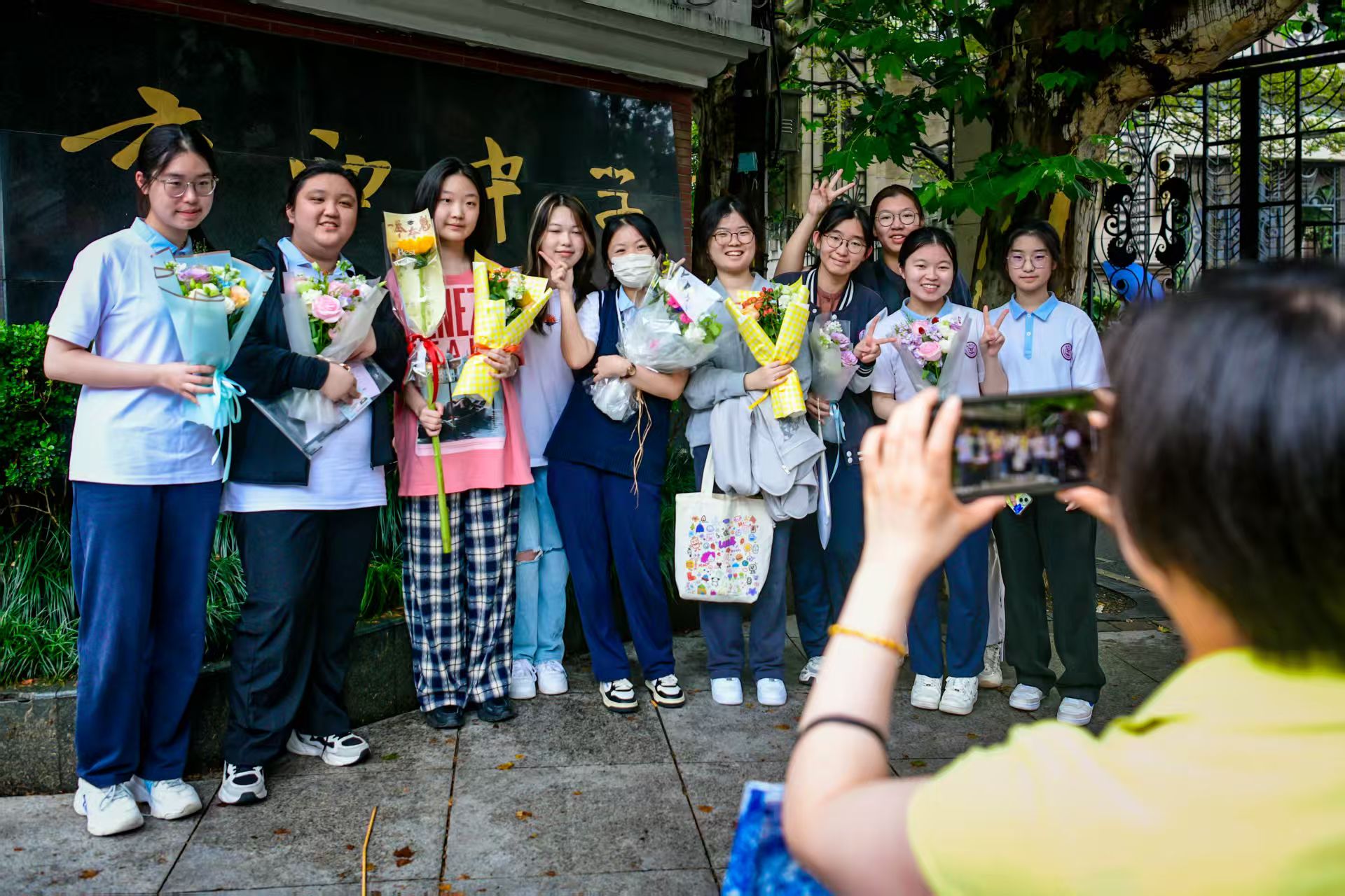 头图为高考结束后,考生在考点外合影留念。劳动报记者 颜筱依 摄影