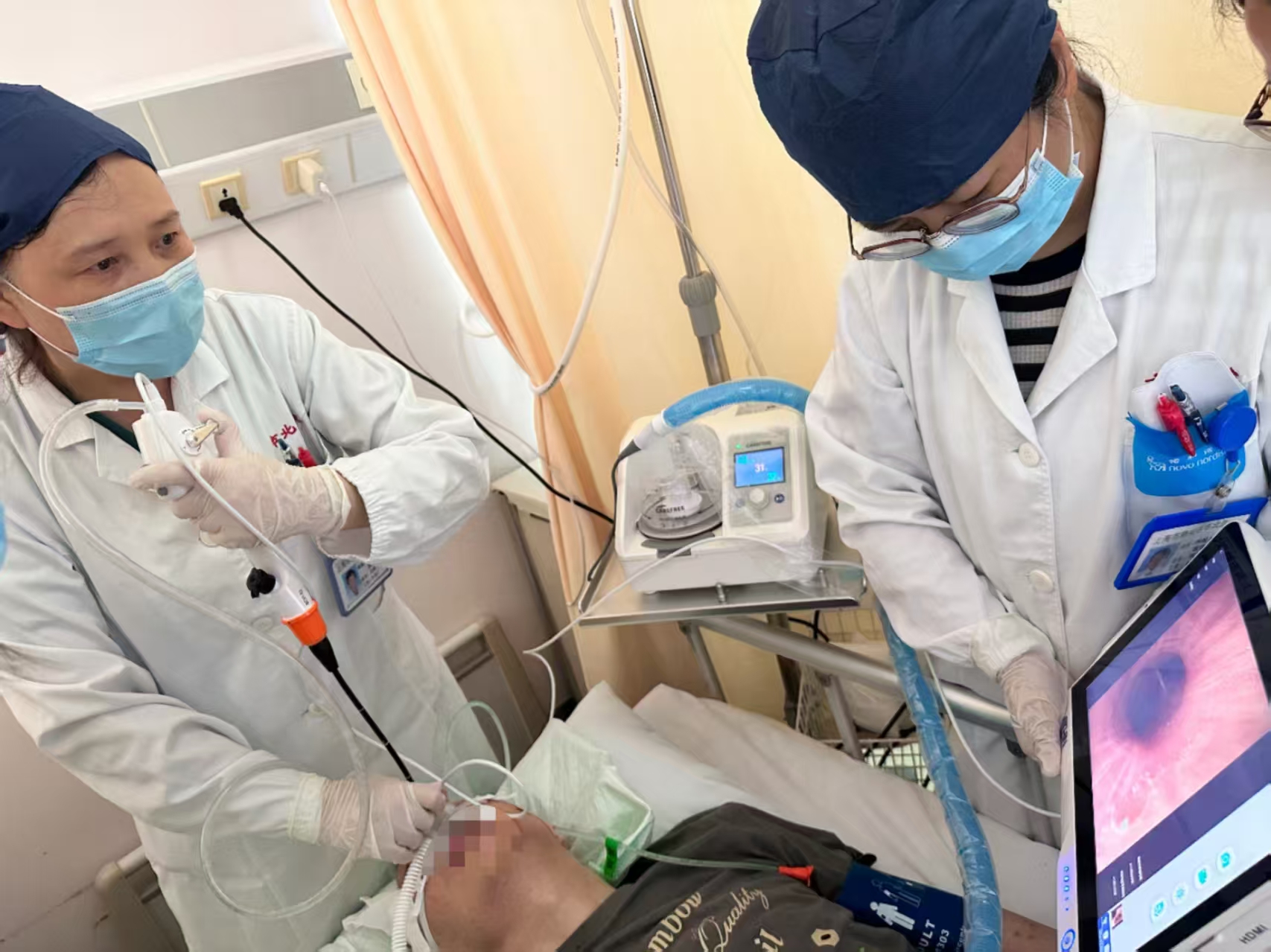 头图为王瑾主任正在给社区医院转来的危重症患者进行床边气管镜检查。姬广玲 摄影