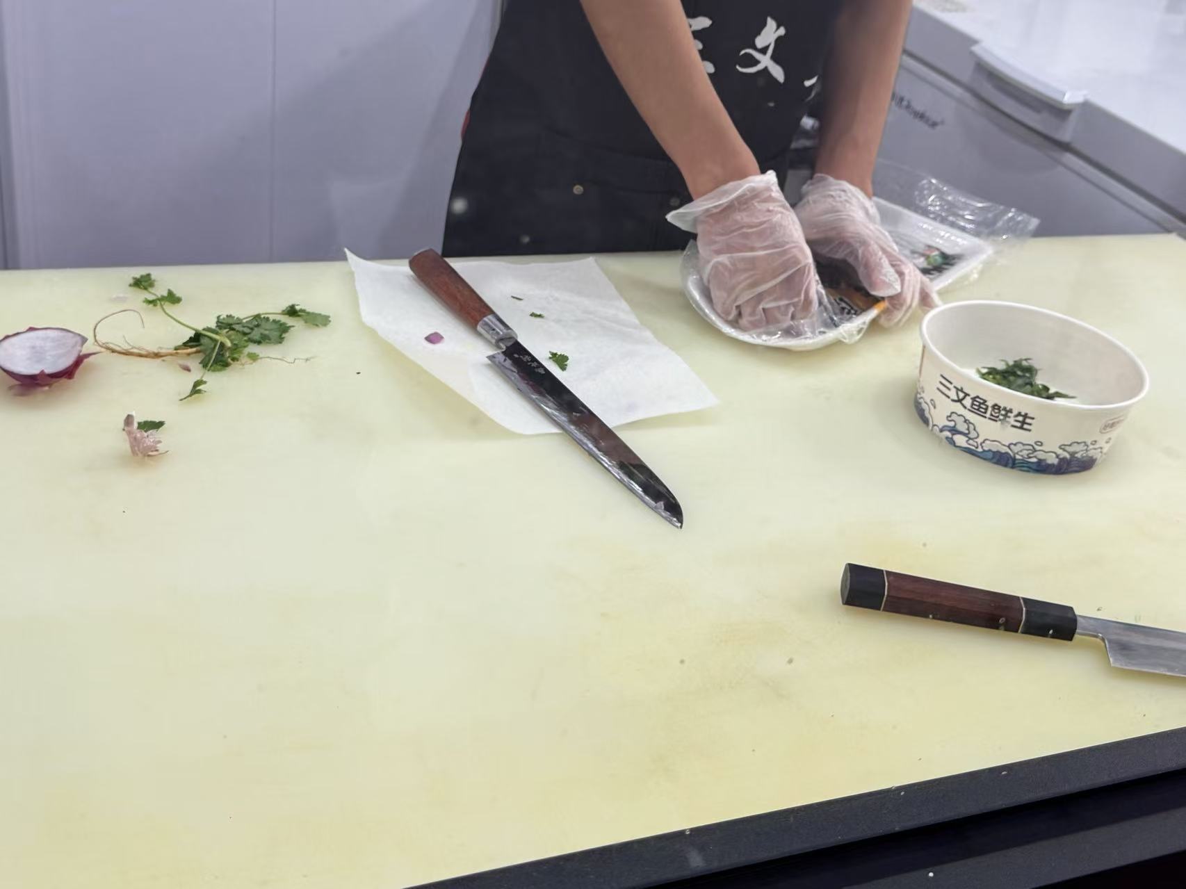 店员制作生腌黑虎虾的全过程。李美慧 摄像