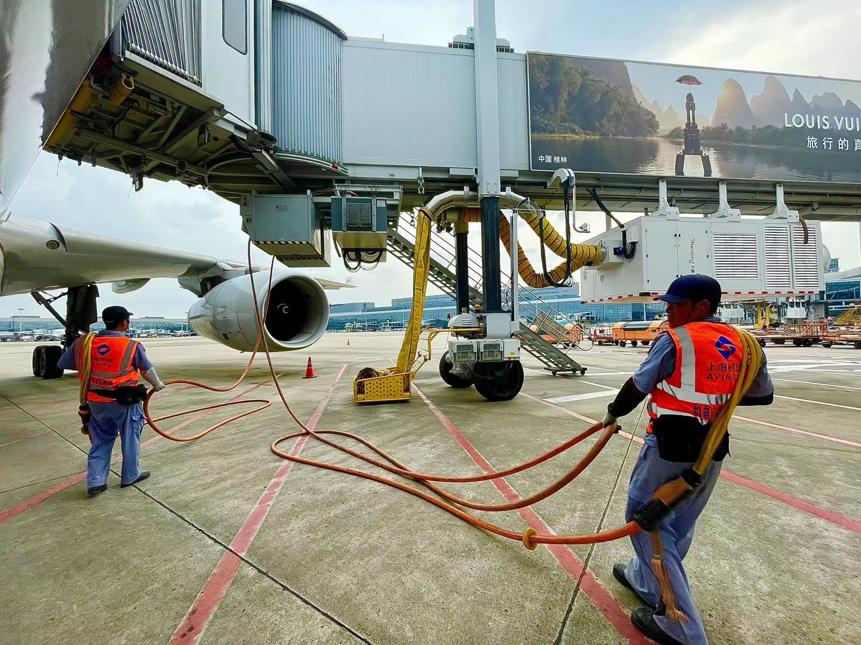 桥载设备操作员正在为降落的飞机安装空调管路。劳动报记者 包璐影 摄影