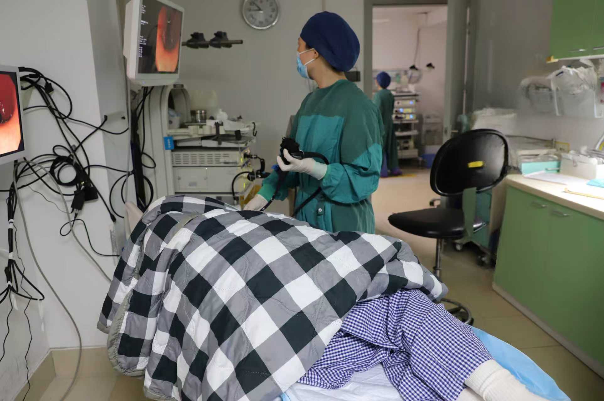 头图为患者盖着小棉被、穿着定制的肠镜检查裤,戚红霞副主任医师正在给患者做胃肠镜检查。摄影 魏毅