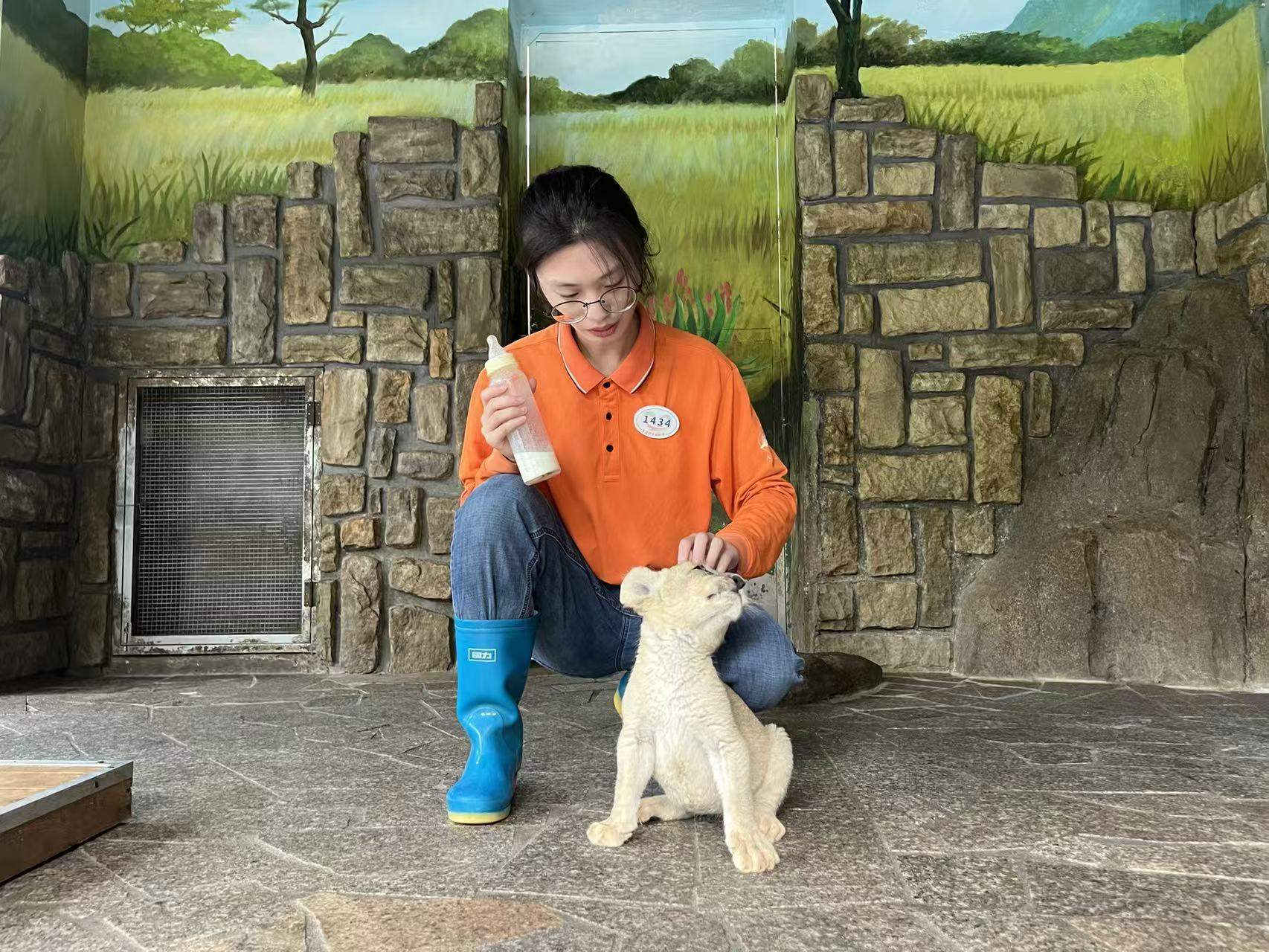 这个看似文静、内敛的00后姑娘,在同事眼中却格外有担当。2022年有一段时期,她主动请缨,同时照顾出生不到一周的非洲狮、两头小黑熊、一只耳廓狐、三只小水獭和一只黑白领狐猴宝宝,还通过直播分享“带娃”日常,观看量突破千万,引来无数网友点赞。