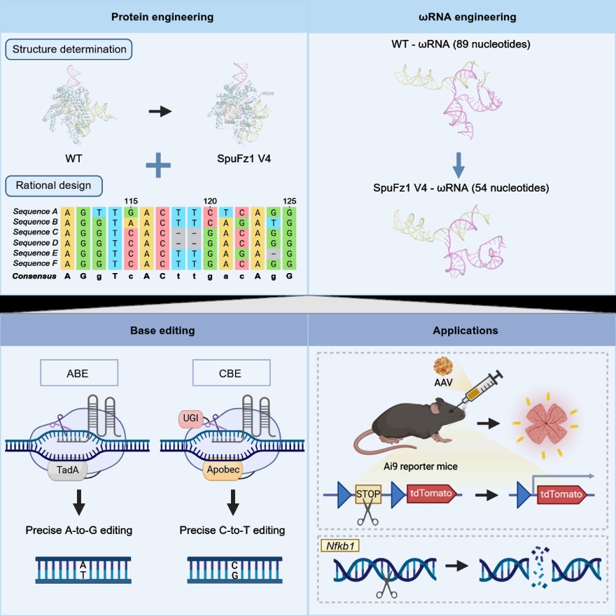 Cas9/Cas12因体积大难被单AAV装载。Fanzor作为真核生物中的RNA引导DNA内切酶,因尺寸小,被视为突破体内递送瓶颈的潜在“利器”,但其长期受困于哺乳动物细胞内的编辑活性与稳定性不足。