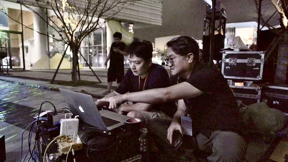 头图为第二届上海国际光影节,谢渝熙在现场进行灯光效果调试。受访者供图