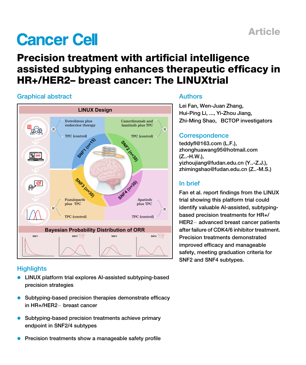 12月4日,复旦大学附属肿瘤医院乳腺肿瘤中心主任兼多学科综合诊治团队首席专家邵志敏教授领衔团队,发布一项名为LINUX的多中心、随机、对照Ⅱ期平台临床试验研究成果。成果建立起可供临床转化的“复旦腔面型乳腺癌四分型”分子分型系统,首次运用AI模型驱动临床研究,找到免疫调节型和RTK驱动型的腔面型乳腺癌患者精准治疗靶点,通过匹配相应靶向药物,证实可显著提升疗效。该研究发表在国际顶级期刊《肿瘤细胞》,影响因子高达48.8。