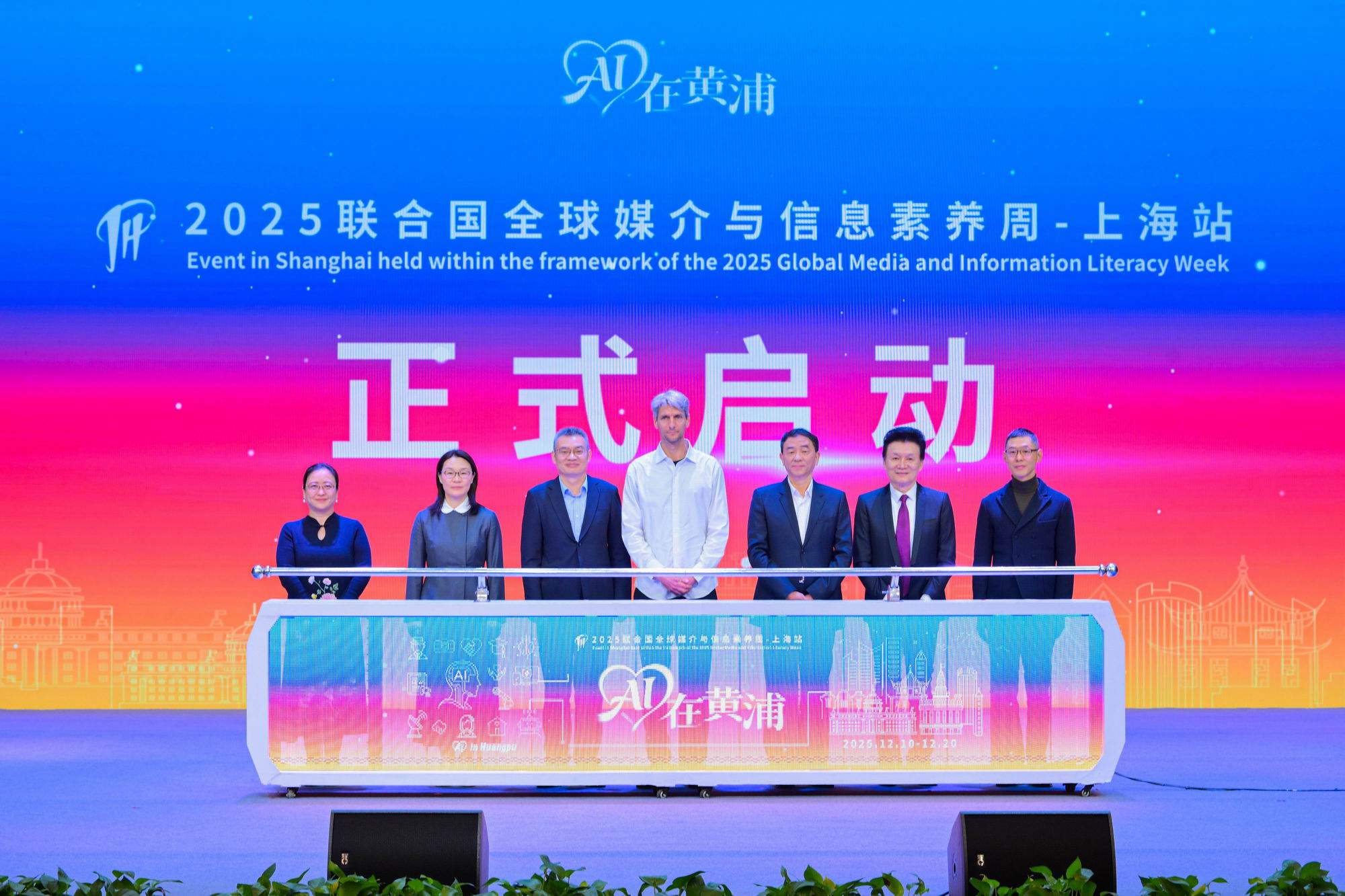 12月10日上午,2025联合国全球媒介与信息素养周·上海站活动在卢湾教育文体中心正式启动。这场由上海市黄浦区教育局主办,为期十天的盛会,以“AI 在黄浦”为核心主题,巧妙串联“AI”与“爱”的双重意蕴,在全球视野与本土实践的交融中,探索AI时代媒介素养教育的新可能,引导青少年在数字浪潮中坚守真实、传递温情。