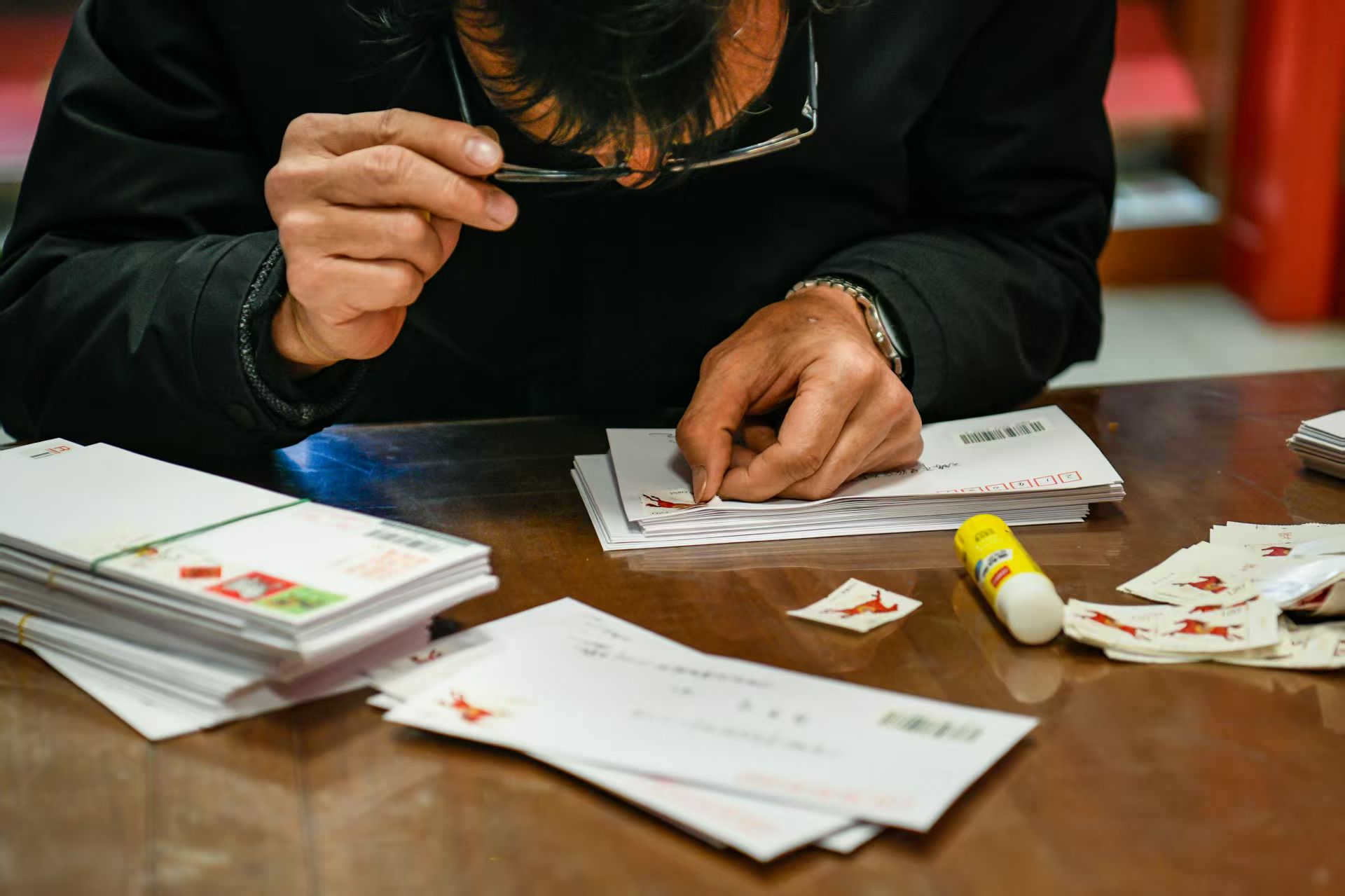 买到邮票后,邮迷迫不及待将其贴在信封上。劳动报记者颜筱依摄影