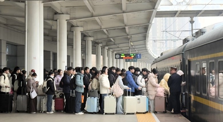 头图为旅客正在候车站台上准备排队上车。铁路部门供图