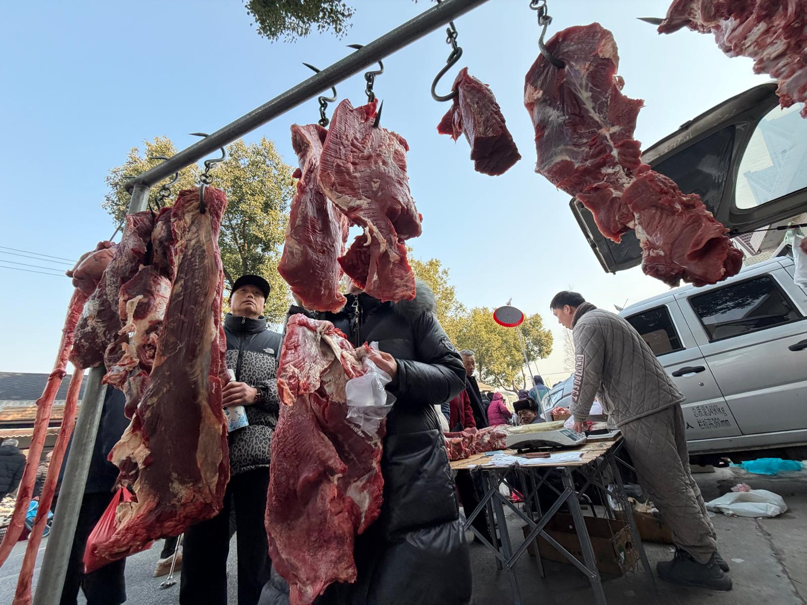 图为新鲜的牛羊肉吸引了不少顾客。劳动报记者 贡俊祺 摄影
