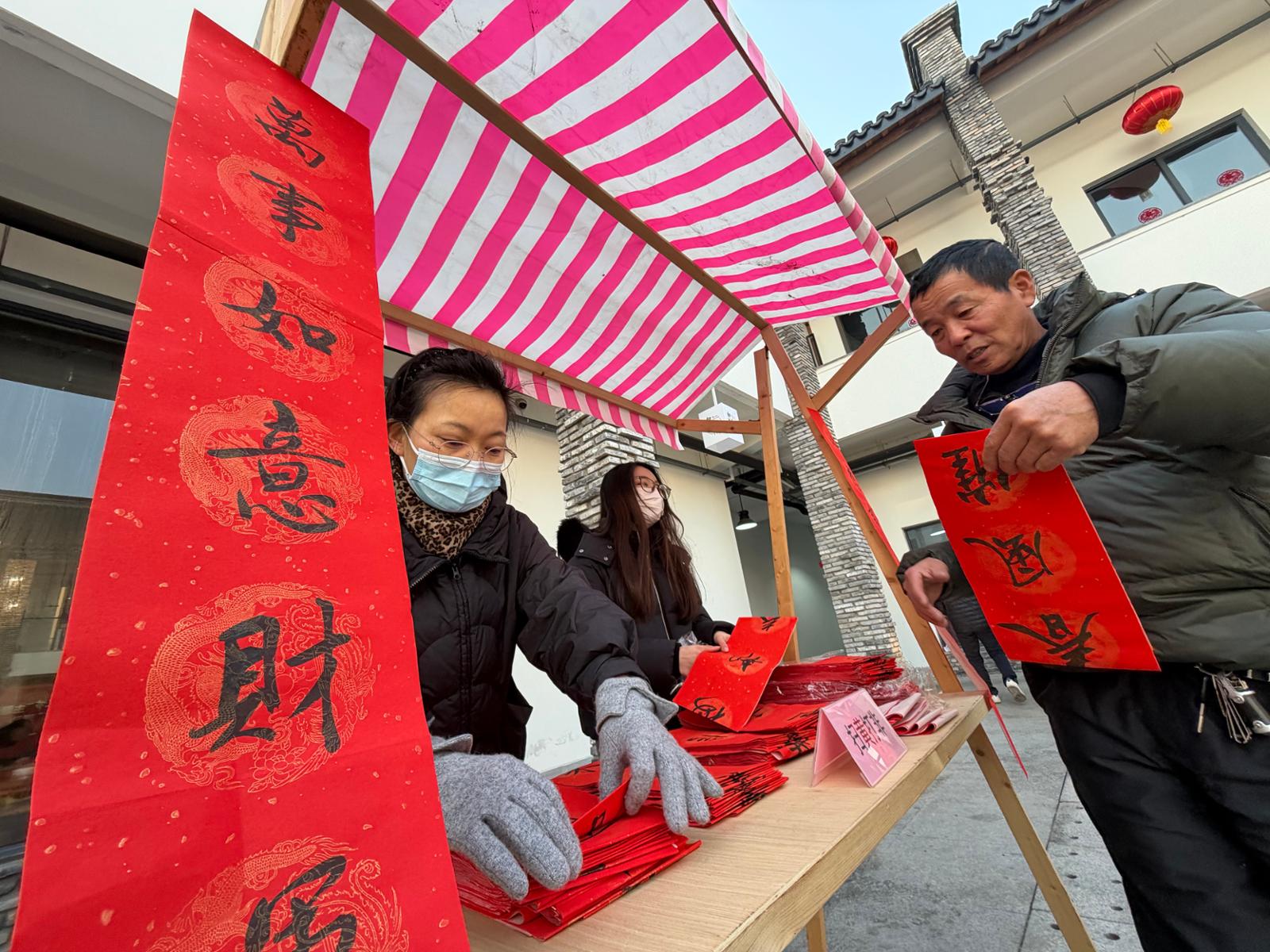 图为书法家们为乡亲们送上春联福字。劳动报记者 贡俊祺 摄影