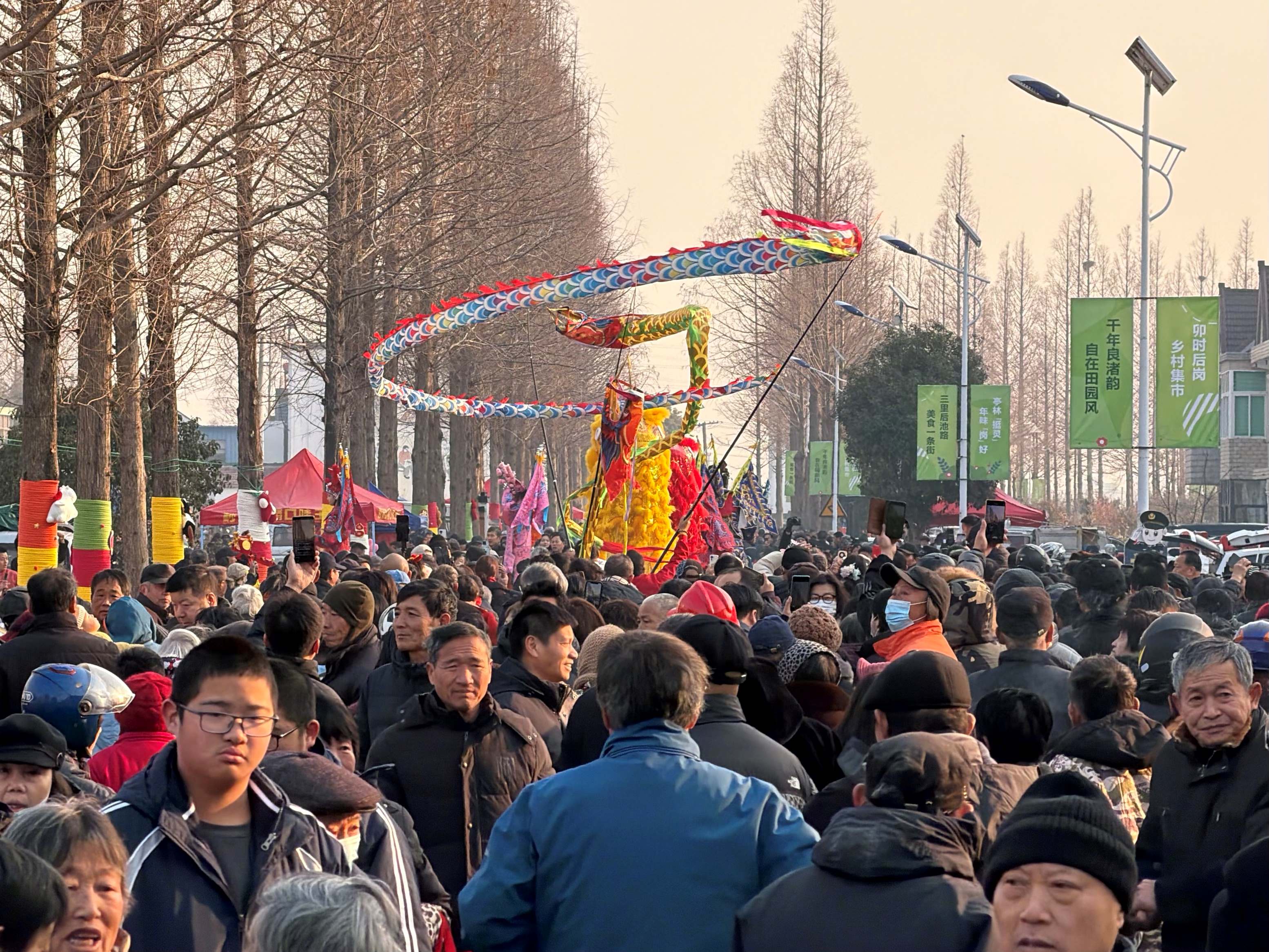 图为“卯时后岗·乡村集市”拉开帷幕,传统踩高跷、舞龙舞狮将气氛带到高潮。劳动报记者 贡俊祺 摄影