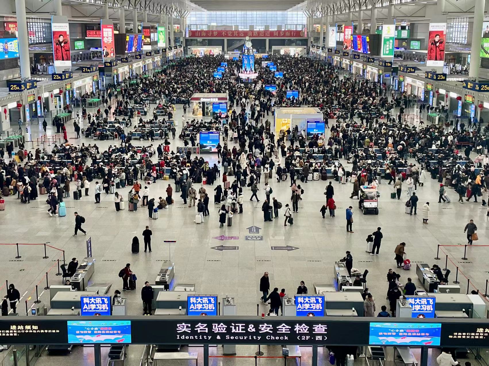 春运返乡的氛围也在各种喜庆的装饰下变得越发浓烈。记者在上海虹桥站看到,候车大厅内内悬挂着大小不一的红色灯笼和中国结,设置的各种春节主题景观也氛围感十足,不少旅客还特地在马年打卡点前拍照留念,广播里也播放着年味乐曲,显示屏上则滚动着新春视频。