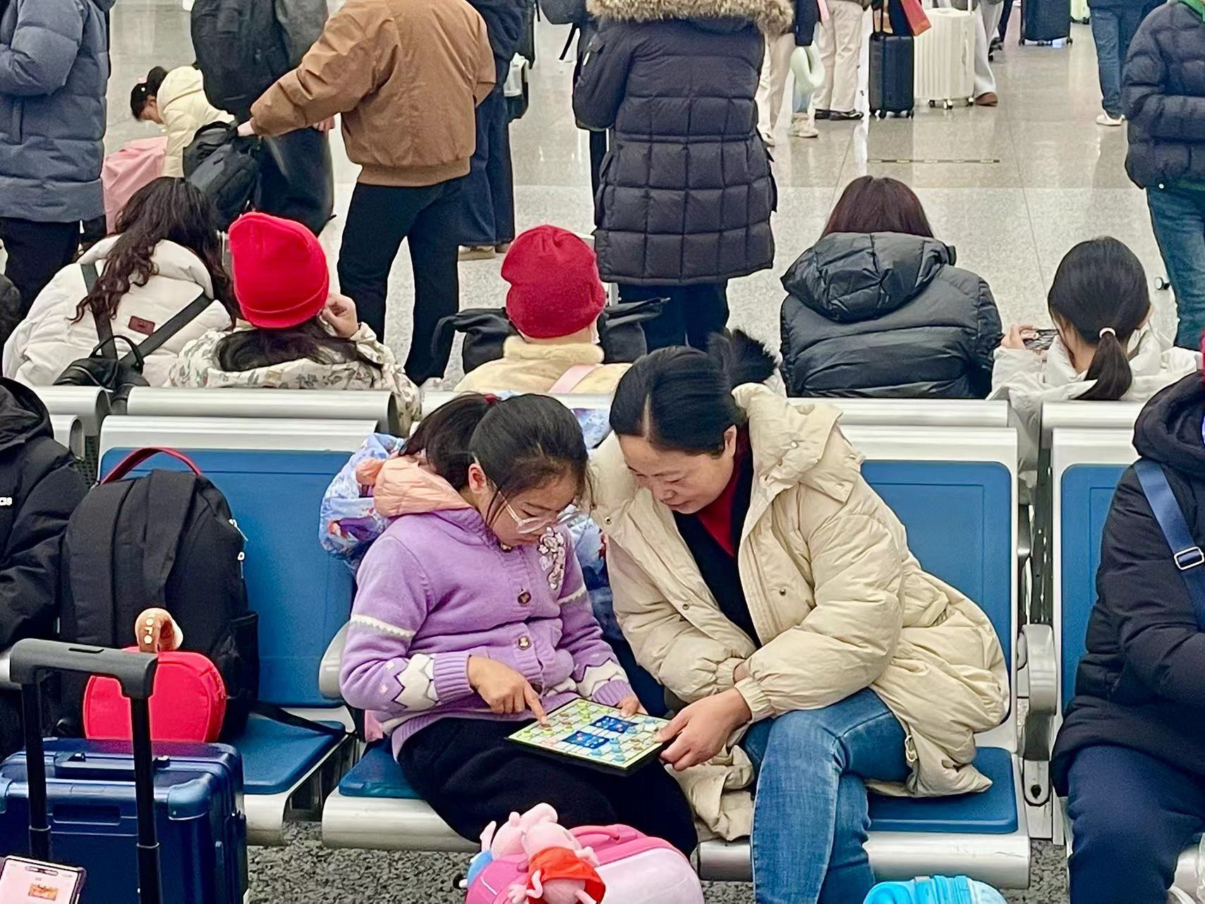 记者看到,候车期间,有母亲耐心地陪着孩子走起了游乐棋,有旅客在一旁戴着耳机默默阅读着电子书籍,也有人乘着间隙去餐饮店铺吃上一碗热腾腾的面条。