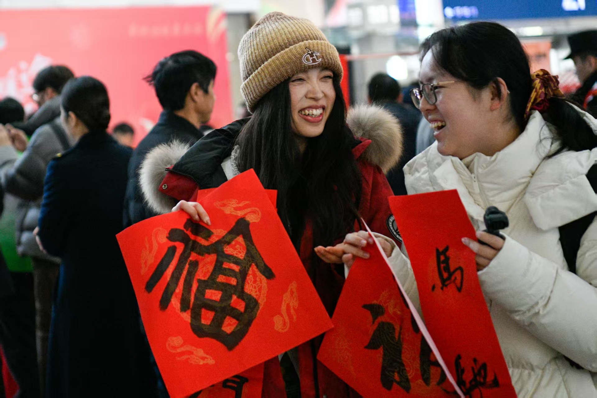 车站内送春联、写福字活动缤纷、热闹非凡。劳动报记者 颜筱依 摄影