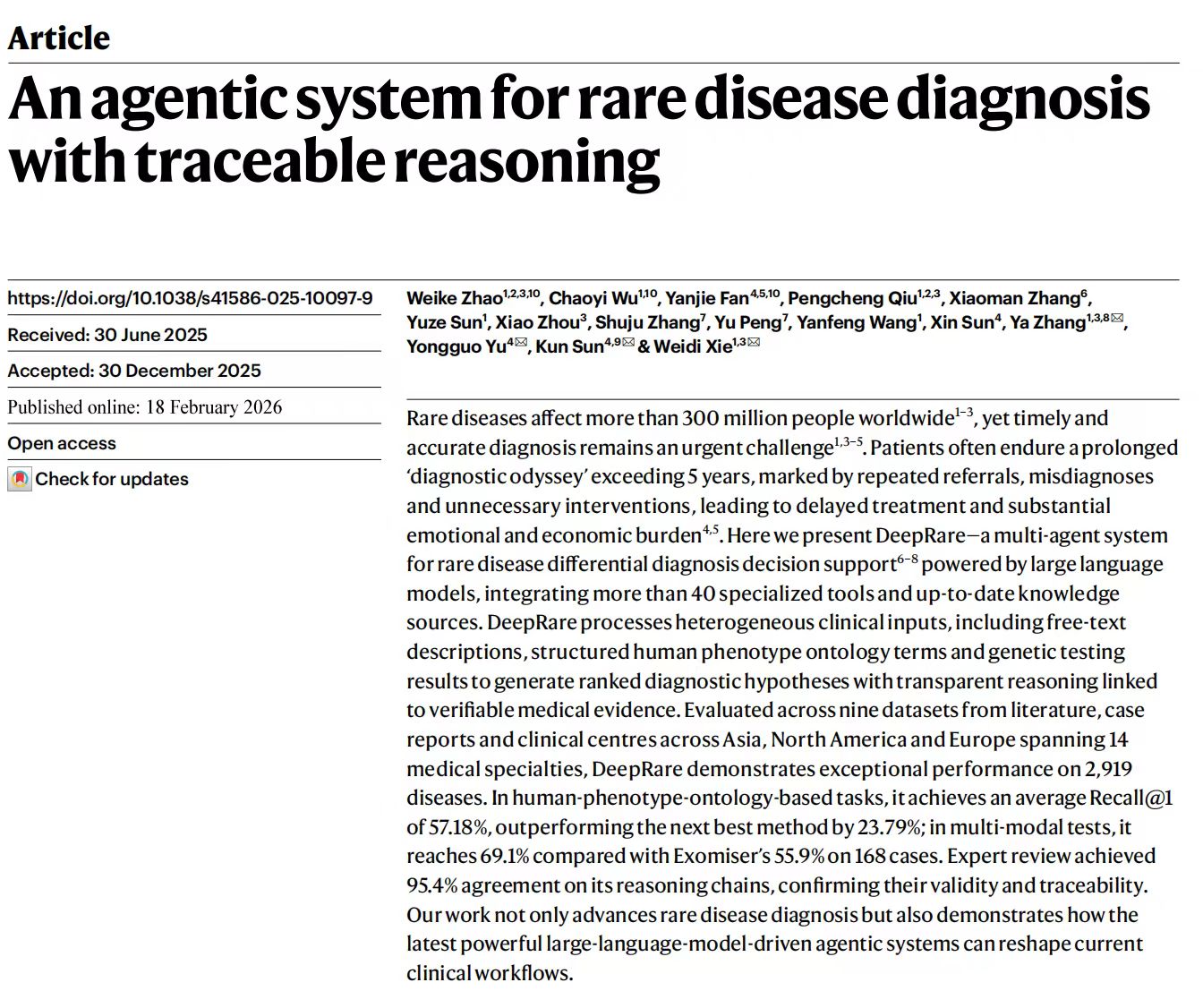 新春佳节之际,中国人工智能与医学交叉领域迎来重磅突破。北京时间2月19日凌晨,国际顶级学术期刊《Nature》在线刊发上海交通大学医学院附属新华医院孙锟教授、余永国教授领衔团队与上海交通大学人工智能学院张娅教授、谢伟迪副教授领衔团队联合研究成果:全球首个可溯源智能体式罕见病诊断系统DeepRare。凭借首创的Agentic AI架构破解罕见病诊断世界性难题,诊断精度刷新世界纪录,其相关应用已服务全球600余家顶尖医疗科研机构,为全球罕见病患者点亮确诊希望,也标志着中国医工交叉创新成果站上世界舞台中央。