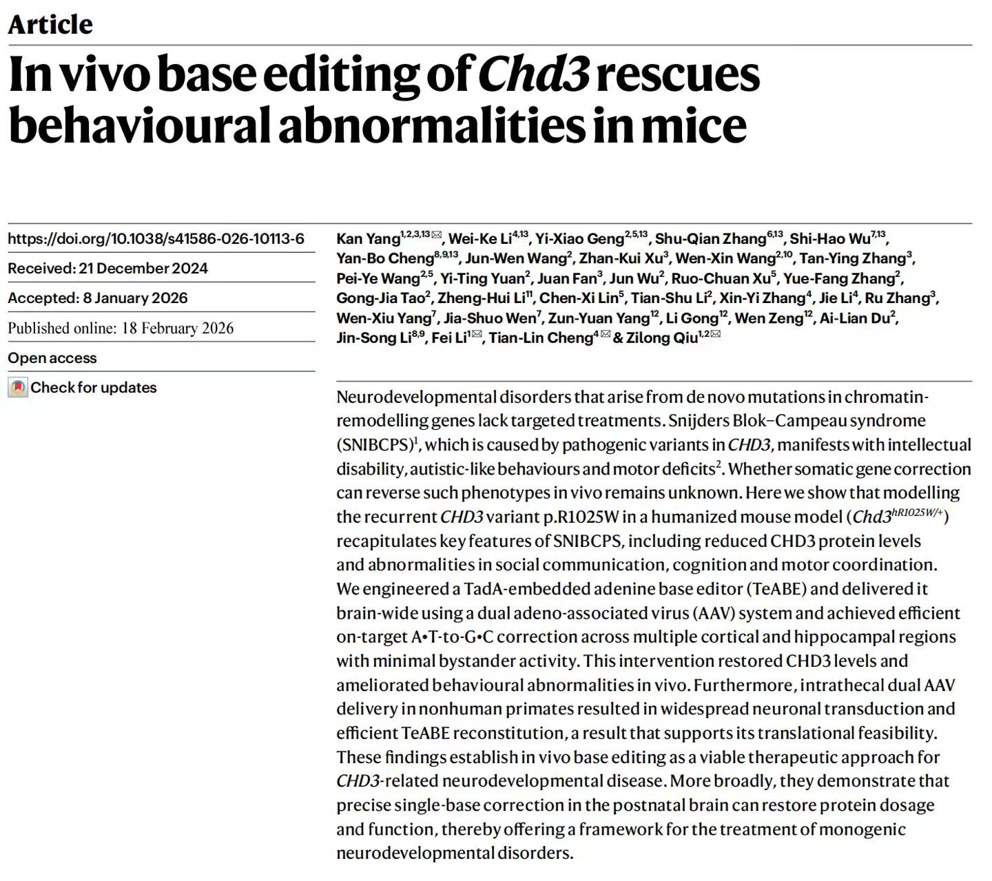 同一时间,上海医学科学家另一研究成果也在《Nature》刊发:脑内“精准修错”或改写神经疾病困境。项目由新华医院发育行为儿童保健科及教育部-上海市环境与儿童健康重点实验室教授李斐、副研究员杨侃团队,与上海交通大学医学院松江研究院仇子龙教授团队、复旦大学脑科学转化研究院研究员程田林团队和中国科学院分子细胞科学卓越创新中心李劲松院士团队合作完成,让全球神经发育疾病患者家庭看到了治疗的曙光。