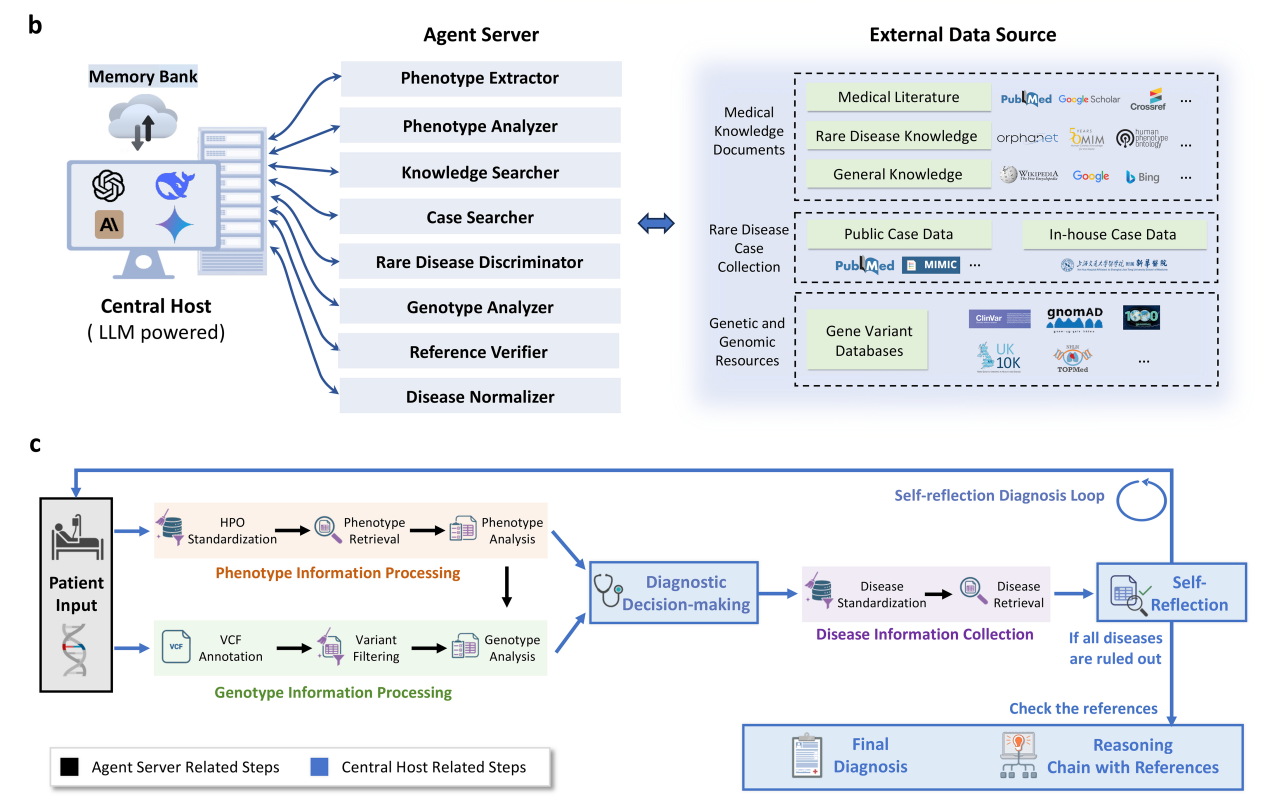 在知识储备上,DeepRare打破医学数据孤岛,如同连接了全球所有顶尖医学图书馆和临床案例库,实时整合海量医学文献知识库与真实临床病例数据,不再是简单的信息检索,而是对医学知识的深度理解与内化,为每一次诊断调动全球顶尖医学储备。在诊断思维上,它跳出传统AI的“模式匹配快思考”,拥有了人类医生的“慢思考”能力,能主动提问补充患者信息,通过“假设-验证-自我反思”的迭代循环推敲诊断线索,修正逻辑漏洞,就如同资深医生反复研判病情的专业过程。在推理过程上,它实现全流程白盒推理,每一个诊断结论都附带完整证据链条,让医生既能知道诊断结果,更清楚诊断依据,彻底破解AI医疗的“信任难题”。