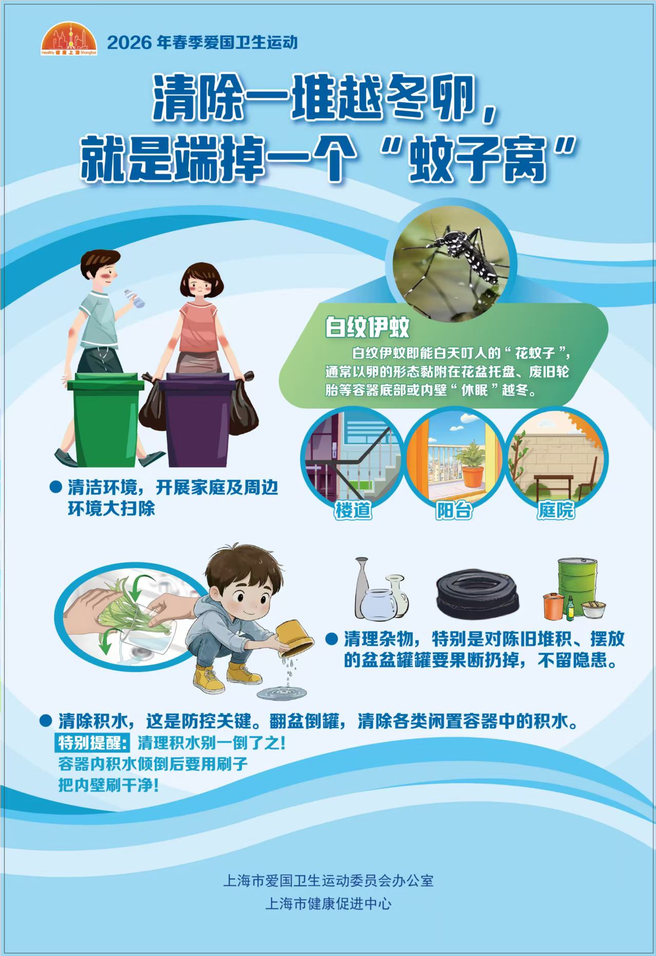 据介绍,活动将按“周”推进:3月23日起为“春季蚊虫孳生环境清理周”,3月30日起为“春季灭鼠统一投药周”,4月20日起为“春季成蚊消杀控制周”;4月27日起开展为期两周的病媒生物防制集中执法检查;4月至5月推广《上海市媒介白纹伊蚊预防控制指南》;4月23日起为“卫生陋习集中劝阻周”,倡导社区、单位和居民开展环境清洁行动。