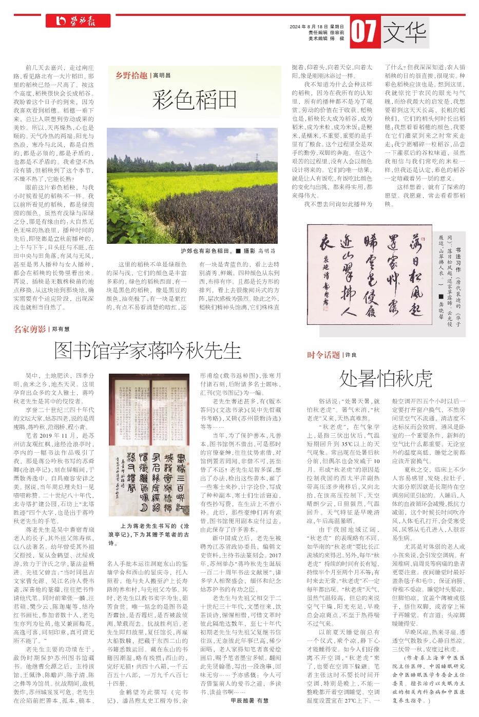 前几天去嘉兴,走过南庄路,看见路北有一大片稻田。那里的稻秧已经一尺高了。按这个高度,稻秧很快会长成稻谷。我盼着这个日子的到来,因为我喜欢看到稻穗。稻穗一垂下来,总让人联想到劳动成果的美妙。所以,天再燥热,心也是顺的。天气冷热的两端:阳光与热浪,寒冷与北风,都是自然的,都是必须的,都是矛盾的,也都是不矛盾的。我希望不热没有错,但稻秧到了这个季节,不燥不热了,它能长熟?