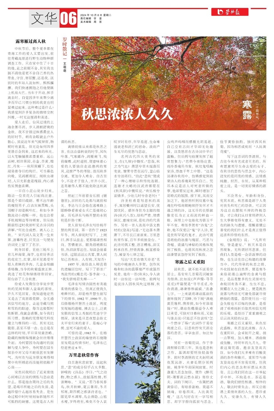 《金刚经》说:“凡所有相,皆是虚妄。”秋天本是自然现象,无所谓好坏悲喜,但我们人类是唯一会讲故事的动物,也生活在自己构建的故事当中。代代传承的秋思之情,外化投射在自然界,便是寒冬来临前漫山遍野的金黄与殷红,是品类繁多的生灵面对生命轮回有条不紊、生生不息;照耀在人生之路上,便是既然衰落与终结无可避免那就尽情燃烧的勇猛,是即使付出一切会失败也不后悔的执着,是看清了艰难挫折后依然相信光明的乐观,是经历了重重磨难之后云淡风轻的从容。