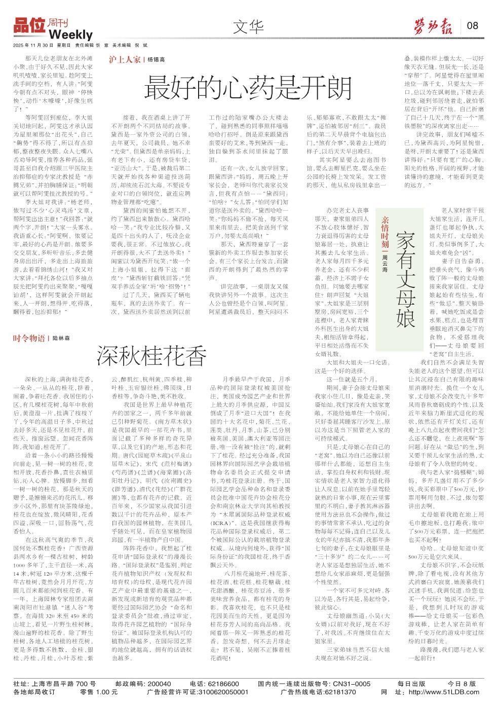 李大姐对我讲:“杨老师,侬写过不少‘心灵鸡汤’文章,帮阿雯出出主意!”我回答:“就两个字,开朗!”大家一头雾水。我语重心长:“阿雯啊,侬要记牢,最好的心药是开朗。侬要多交交朋友,多听听音乐,多去健身房出出汗,多走出上海旅旅游,去看看锦绣山河!”我又对大家讲:“拜托各位以后多抽点辰光把阿雯约出来聚聚,‘嘎嘎讪胡’,这样阿雯就会开朗起来,人一开朗,想得开,吃得落,睏得着,包治抑郁!”