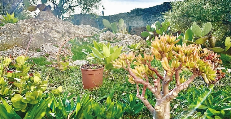 山崖上林立着仙人掌和柠檬树,还有龙舌兰等稀奇古怪的奇花异草。比如眼前这棵筒叶花月,我是请教了AI才知晓,它就是我们中国人所说的吸财树。筒叶花月原产于南非纳塔尔省,叶片翠绿,四季常青。在秋末至早春的冷凉季节,叶端的截面边缘会呈现鲜艳的红色,所以是很美的观叶植物。幸运的我,赶上了观叶的好时节。