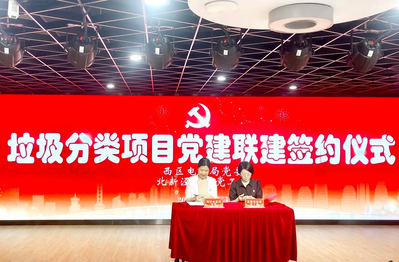 西区电信局党委与北新泾街道党工委垃圾分类项目党建联建签约仪式在活动中举办,双方将以打造宜居、智慧、韧性社区为目标,以服务广大群众为重点,通过发挥联建优势,实现资源整合共享、优势互补、共同发展,以“红色引领”促进“绿色发展”,为垃圾分类工作注入新活力。