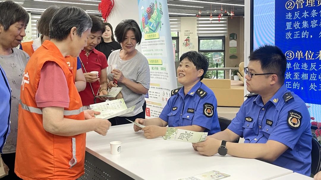 作为活动的特色外场内容,一场垃圾分类特色快闪活动吸引诸多居民参加。北新泾街道为居民发放绿植盲盒,宣传绿色环保理念。街道综合行政执法队开设普法讲座,为居民讲解《上海市生活垃圾分类管理条例》,从法律条例上为居民进行一系列的答疑解惑。