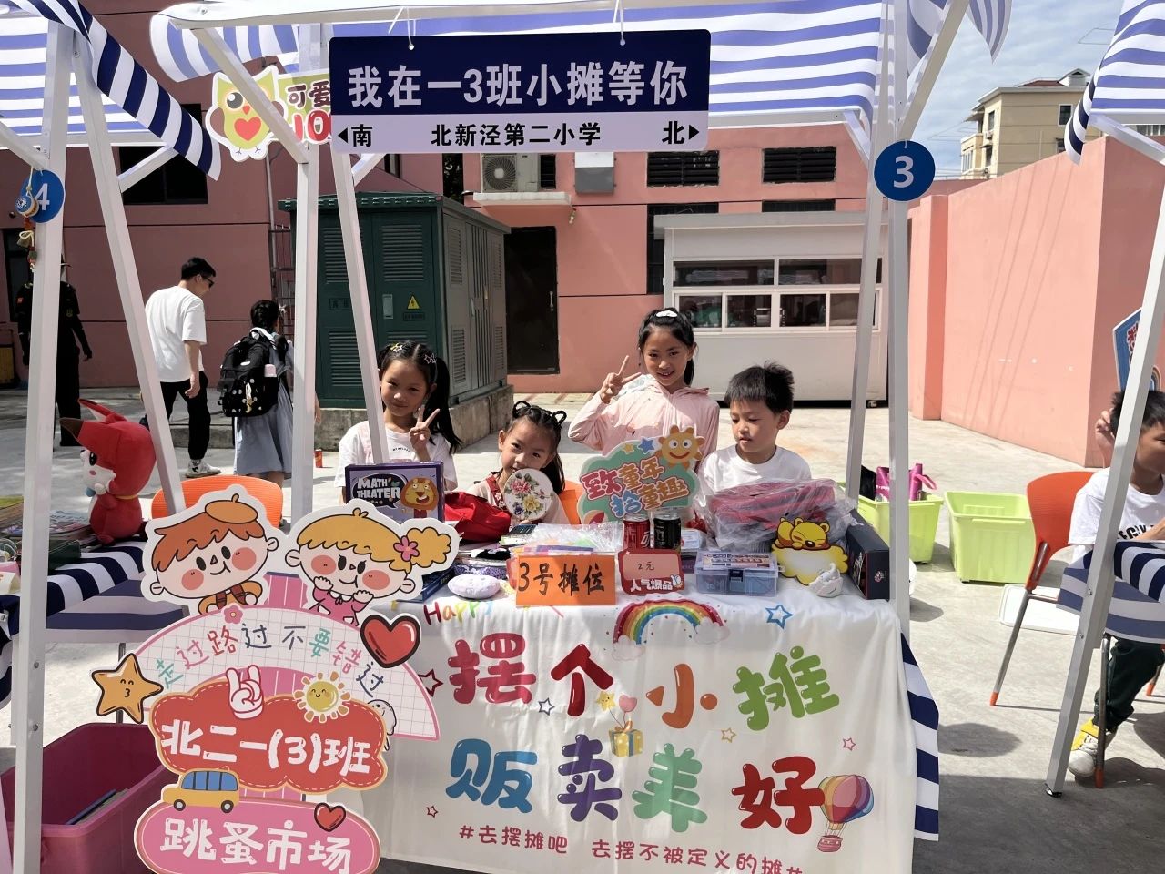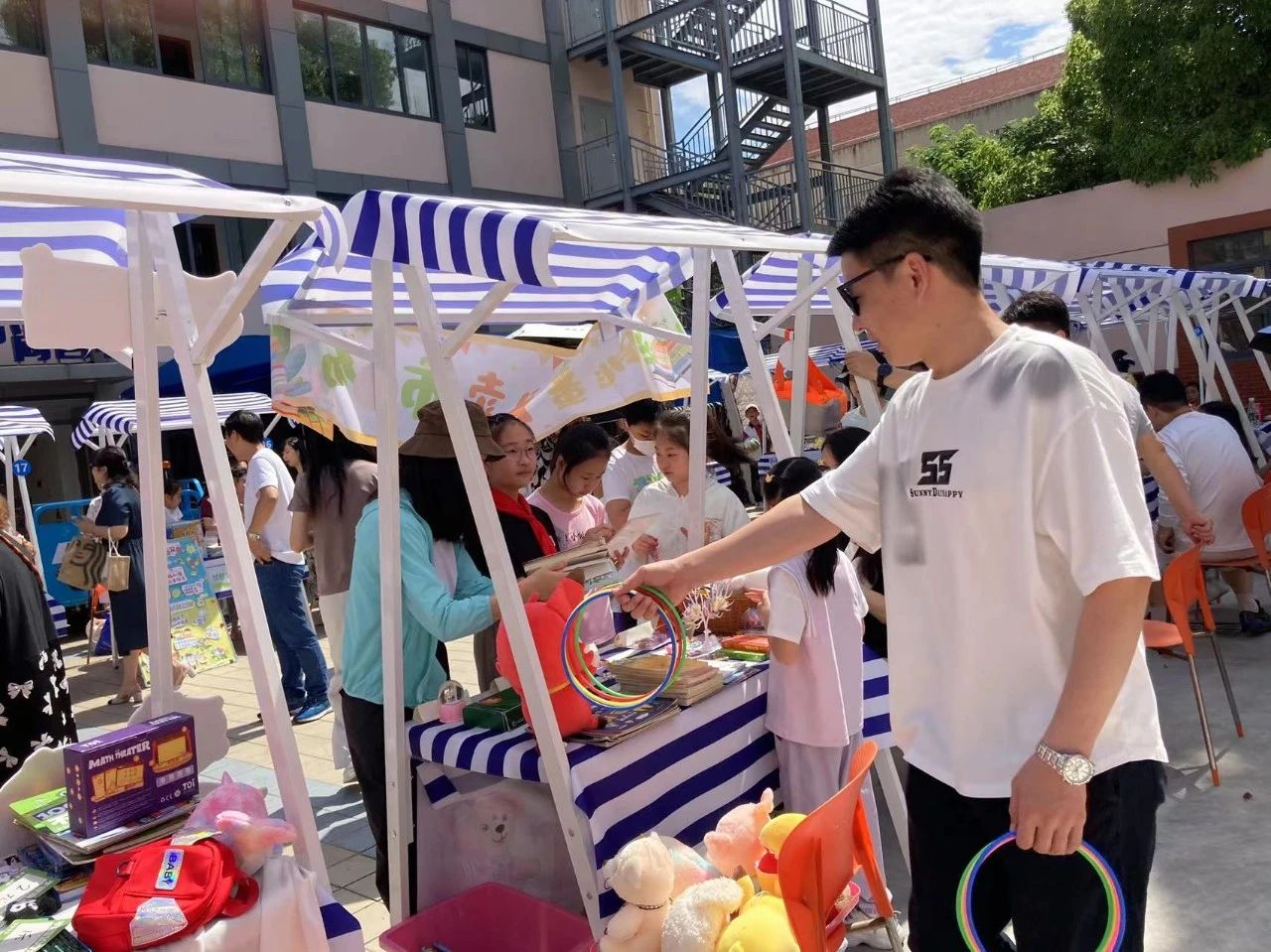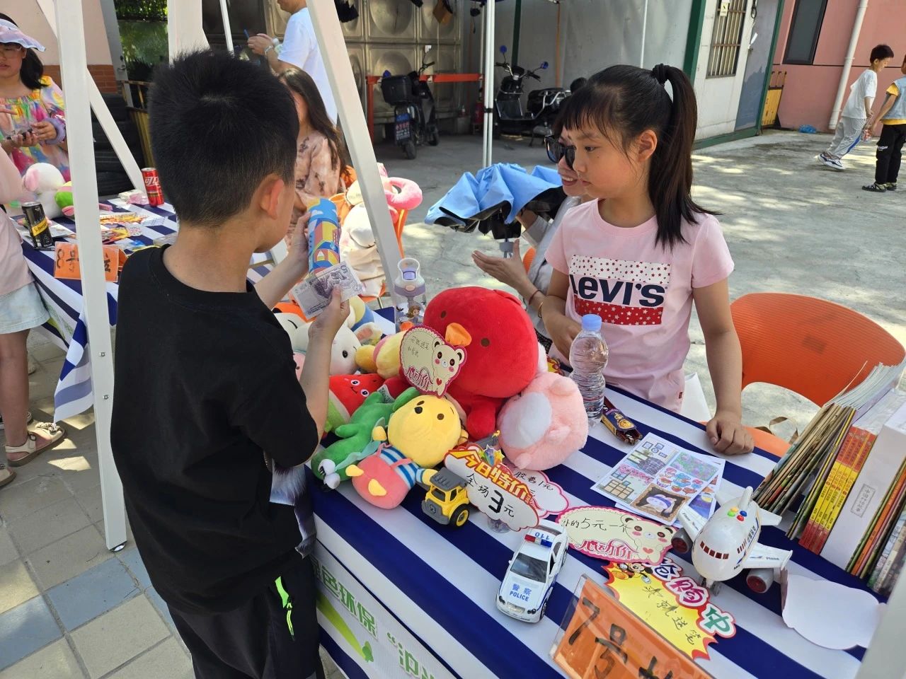 “摆个小摊,贩卖美好”“让爱不再闲置”“来都来了,买一个再走”“祝福和爱,在这里传递”……孩子们将有趣有爱的文案写下来,将小摊位装点得独具特色。各摊位上摆放着丰富多样的物品,有图书、文具、玩具等,现场吆喝声此起彼伏,好不热闹。