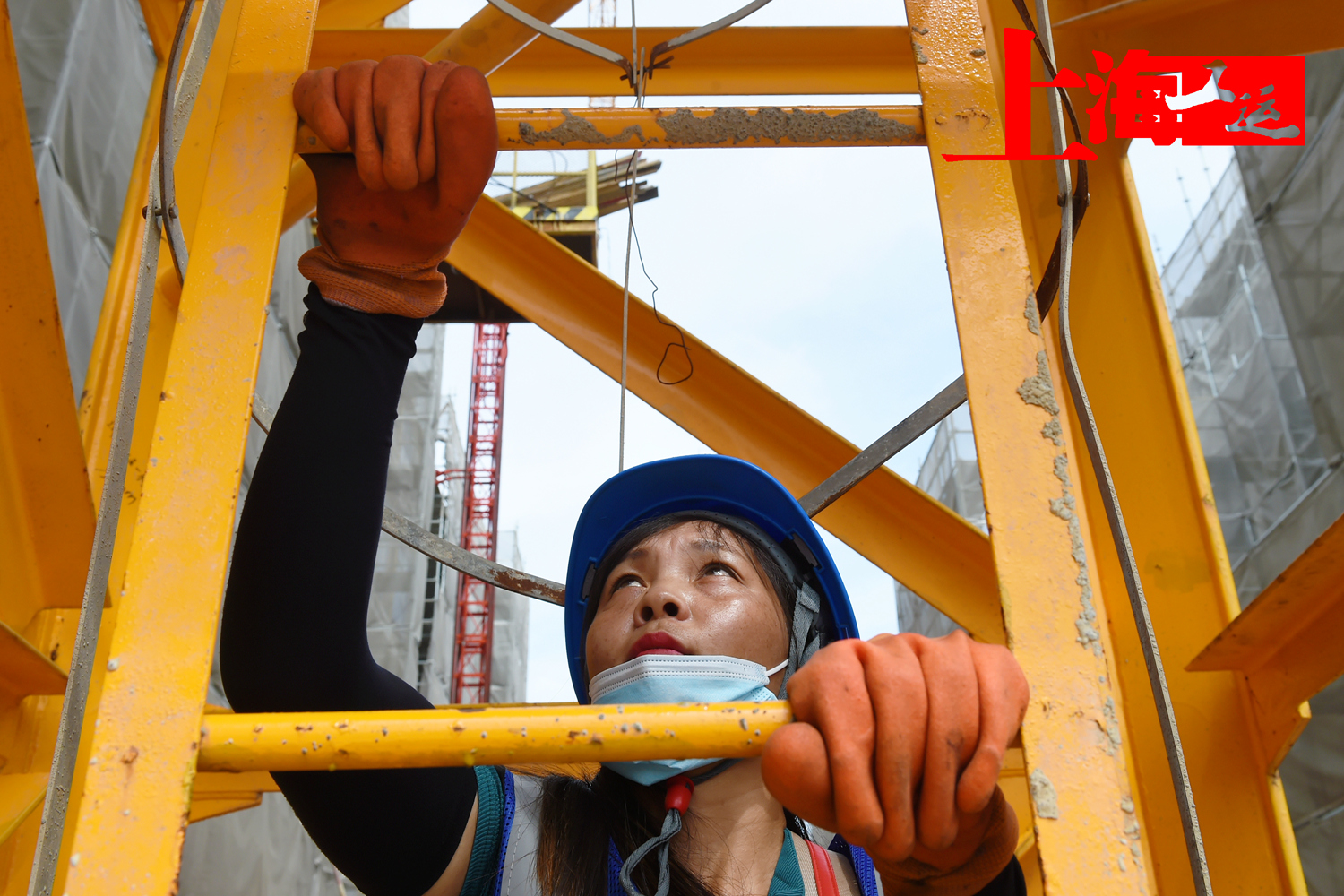 塔吊女司机周正容正站在54米高的塔吊底部,只见她利落地佩戴好防坠器,戴上安全帽,绑好安全带,套上手套,便开始了垂直攀爬,从塔吊底部攀上驾驶室的每一步,周正容都走得坚实有力,随着高度的上升,地面仿佛也被周正容甩到了身后。12分钟后,周正容终于来到驾驶室,来不及喘口气,按下塔吊启动按钮,她又开始了忙碌的工作。