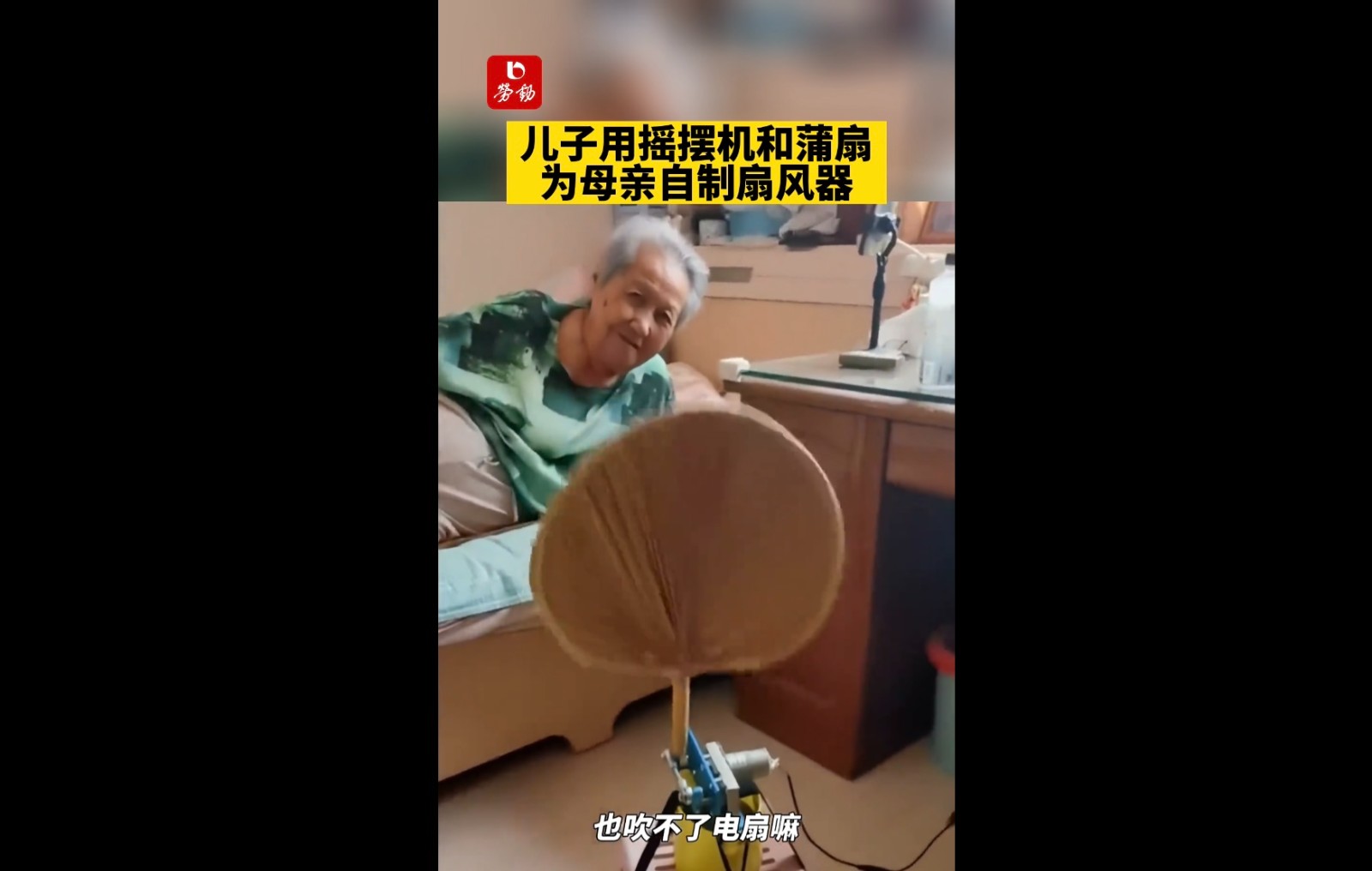 儿子用摇摆机和蒲扇为母亲自制扇风器