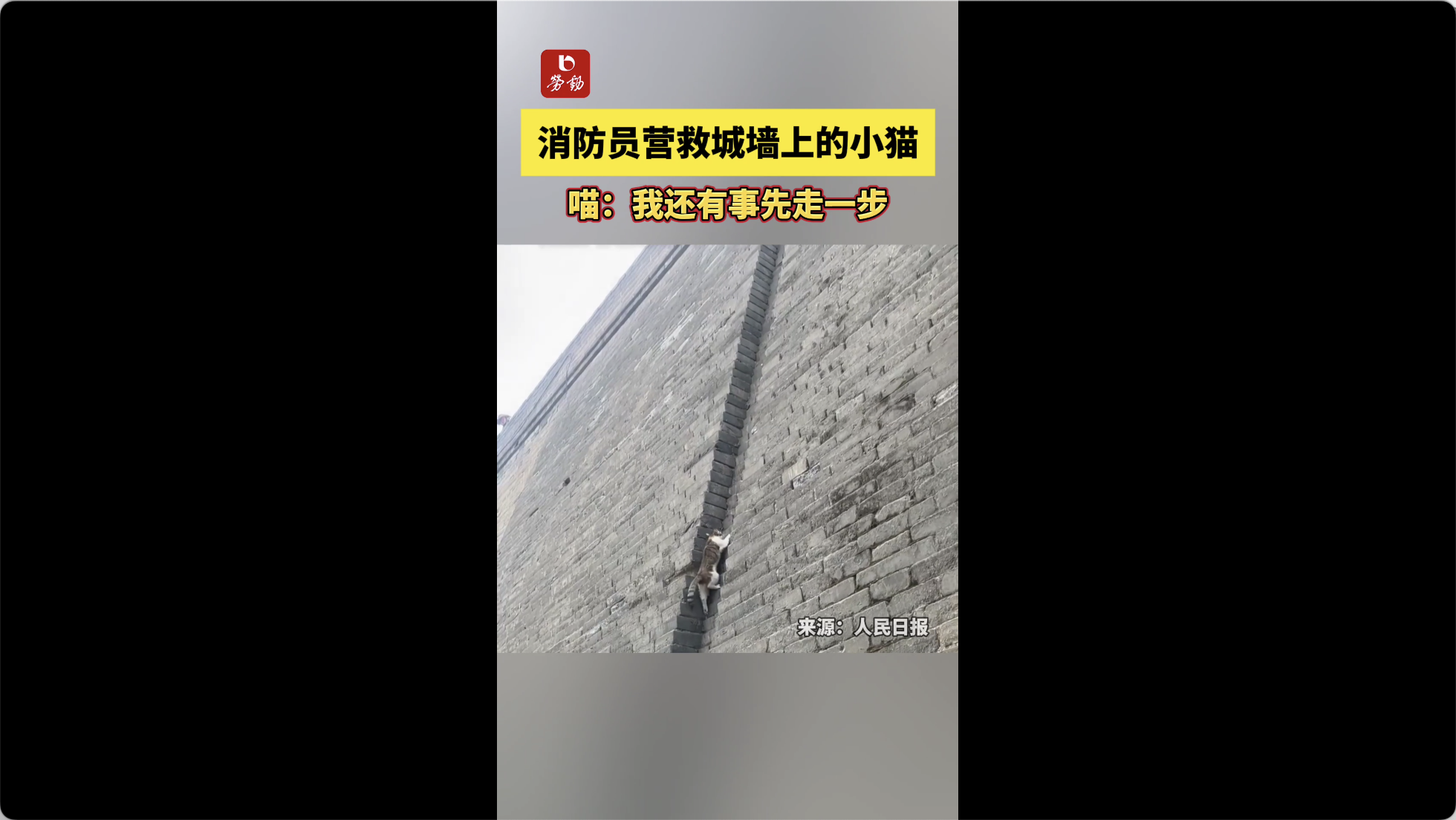消防员营救城墙上的小猫,喵:我还有事先走一步