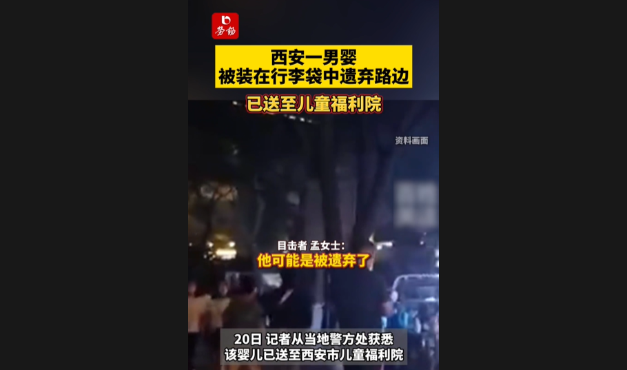 西安一男婴被装在行李袋中遗弃路边,已送至儿童福利院