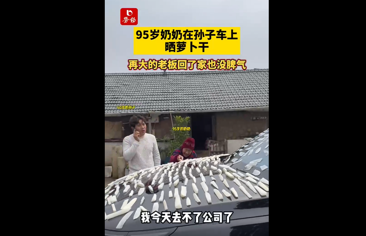 95岁奶奶在孙子车上晒萝卜干,再大的老板回了家也没脾气