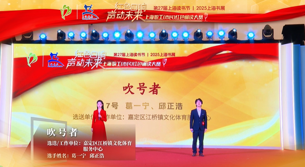 摘要: “红色回响 声动未来”上海职工(市民)红色诵读大赛二等奖作品,来自嘉定区江桥镇文化体育服务中心的葛一宁、邱正浩带来的《吹号者》