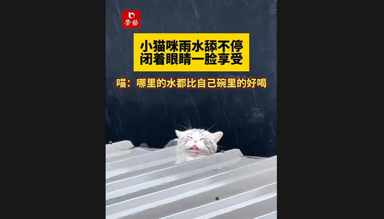 小猫咪雨水舔不停,闭着眼睛一脸享受!喵:哪里的水都比自己碗里的好喝