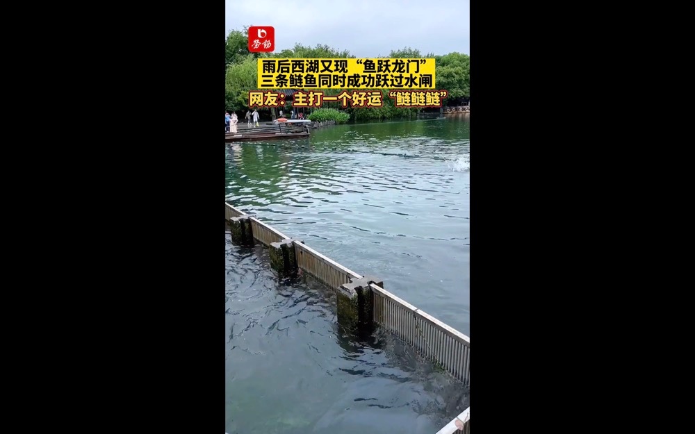 雨后西湖又现“鱼跃龙门”,三条鲢鱼同时成功跃过水闸,网友:主打一个好运“鲢鲢鲢”