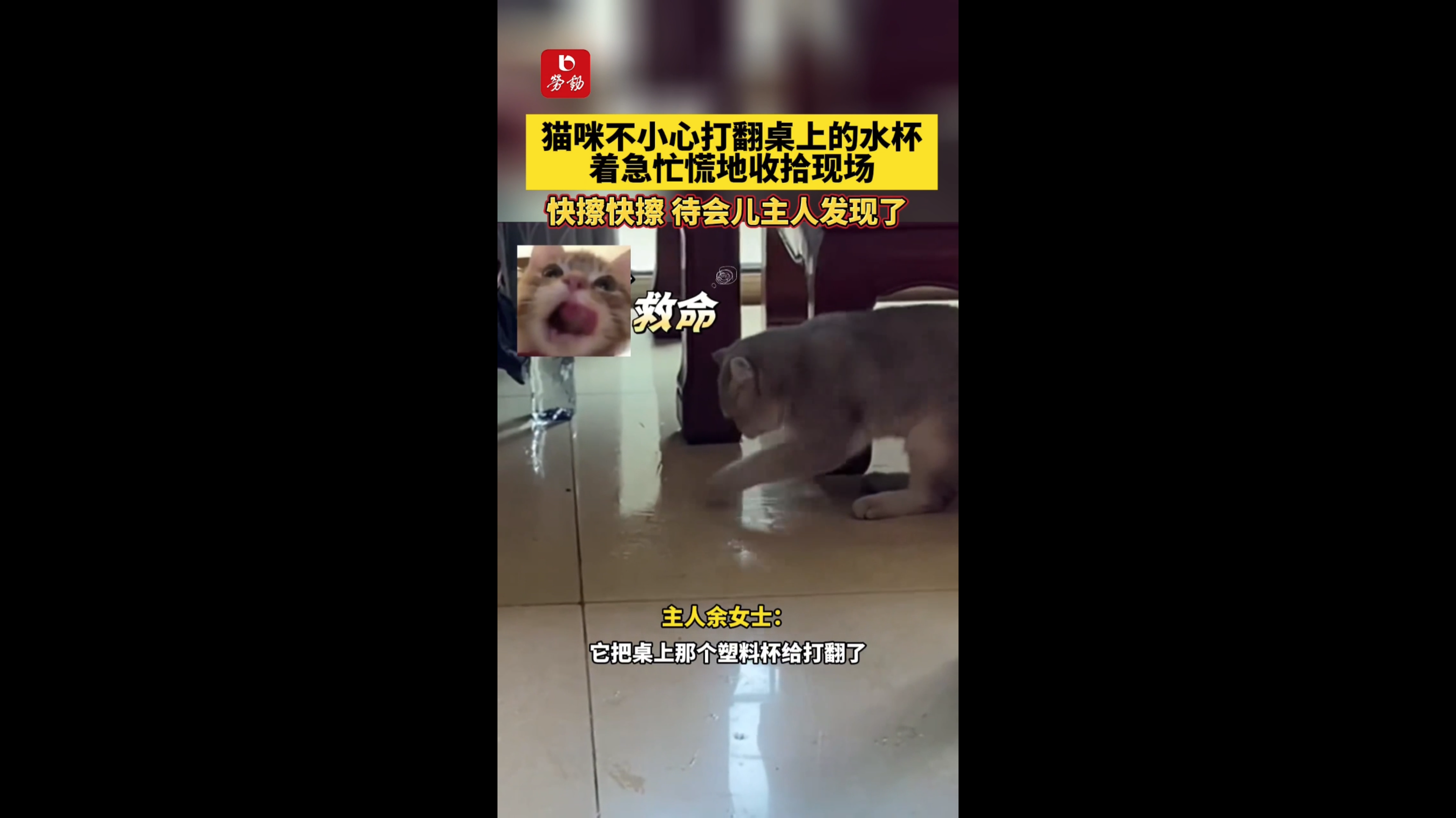 摘要: 猫咪不小心打翻桌上的水杯,着急忙慌地收拾现场。 快擦快擦,待会儿主人发现了。