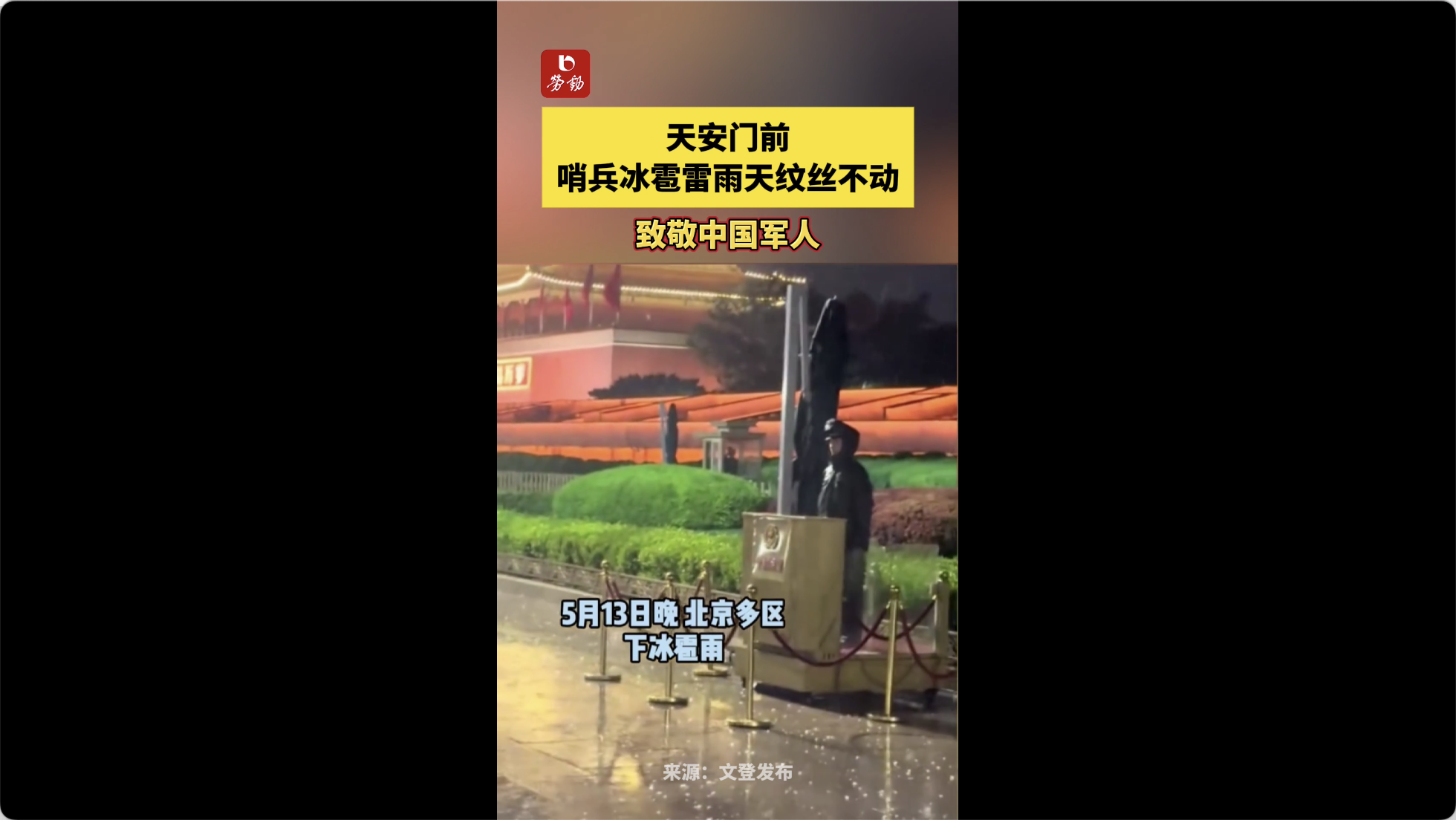 天安门前,哨兵冰雹雷雨天纹丝不动,致敬中国军人